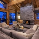 The top floor hosts the open-plan living, dining, and kitchen area. High ceilings and large windows flood the space with natural light, while the cosy L-shaped sofa and armchairs surround a stone fireplace—perfect for relaxing after a day on the slopes. The dining table seats ten, and the well-equipped kitchen makes group meals a breeze.