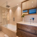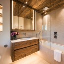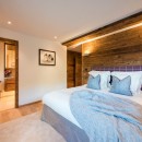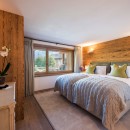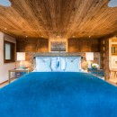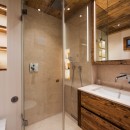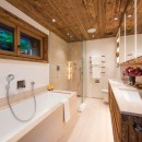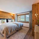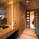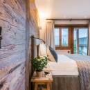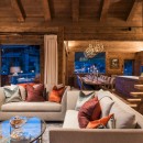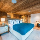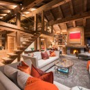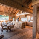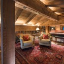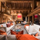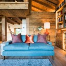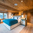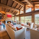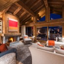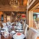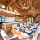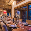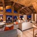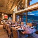 The pinnacle of entertainment and socializing unfolds on the top floor. The staircase leads to a spacious open-plan living and dining area. Here, large sofas, a comfortable daybed, and plush armchairs surround an elegant stone fireplace, while a discreetly placed TV provides additional entertainment options. The double-height ceilings not only flood the space with natural light but also offer awe-inspiring vistas of Verbier. As evening falls and the lights of Verbier twinkle in the distance, guests can enjoy an aperitif in front of the crackling fire before indulging in a candlelit dinner.