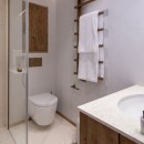 The master bedroom occupies the entire top floor, featuring a dressing room, private balcony, and beautiful en-suite bathroom with his-and-hers sinks and a separate shower. Elegant decor and stylish touches like matte black bathroom fixtures create a cool and calming atmosphere, softened by sunlight streaming in from all angles.