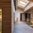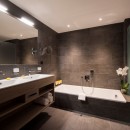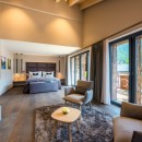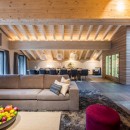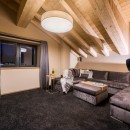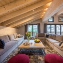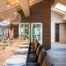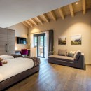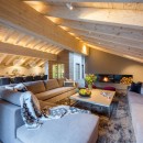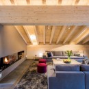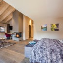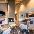 Ascending to the upper level, you're greeted by the generously proportioned and elegantly appointed open-plan living and dining area. A lift, conveniently traversing the property, opens directly into this living space for seamless guest visits. Sunlight cascades into the room through the immense floor-to-ceiling sliding doors, spilling onto the sun-kissed balcony. The grand balcony affords a splendid view of the majestic Matterhorn. As night falls, sophisticated lighting combines with the inviting wood-burning fireplace, fostering a warm and cozy ambiance – the perfect setting for socializing and entertaining. The main dining table accommodates up to 18 guests, extendable to a capacious 24 if desired.
