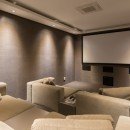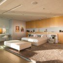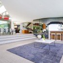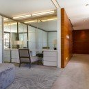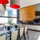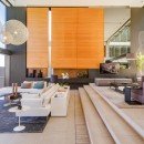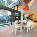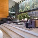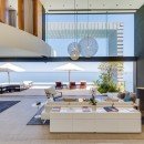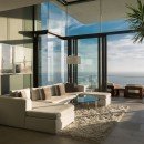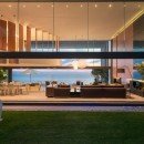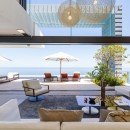 The open wall that connects the terrace to the interior great room creates an expansive and seamless space for relaxation and entertainment, allowing cool ocean breezes to flow through the home. The great room encompasses a generous ocean-facing cocktail lounge, an adjacent seating area with a large TV, an elegant bar, and a splendid dining table for ten. Lush gardens outside the opposite glass wall evoke an ambiance of tranquil coastal serenity.