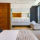 The villa's five exquisite bedroom suites all feature plush queen-sized beds and ensuite bathrooms, each equipped with a standalone shower and a bathtub. The master suite boasts breathtaking ocean views, a large TV, and a spacious desk. Its ensuite bathroom showcases a charming ocean-view bathtub, and its private balcony is furnished with comfortable armchairs. Three of the four guest suites share a balcony and lounge area, while the fourth enjoys its own sea views.