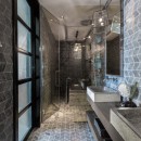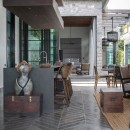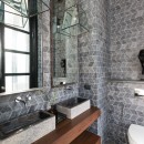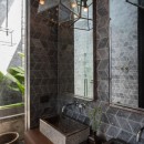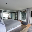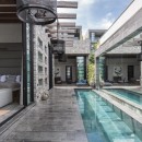 Three aesthetically designed master bedrooms are situated in the courtyard surrounding the second infinity pool, which is backed by a vast mirror and adorned with tropical greenery. The first master bedroom is located behind the living space and features a connecting door to the second bedroom through a walk-in closet. The second master bedroom is positioned at the end of the pool, near the main entrance. All three bedrooms exude elegance, with unique art accessories and high-end furnishings, including extra king-sized beds with special bed toppers, comfortable sofas on a rattan carpet, and blackout curtains adorning floor-to-ceiling glass sliding doors. Each room boasts a walk-in closet and an en-suite bathroom. The en-suite bathrooms of the first and third bedrooms showcase bathtubs carved from natural stone, while all bathrooms are equipped with twin vanity sinks, rain showers, and toilets.