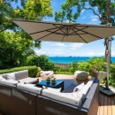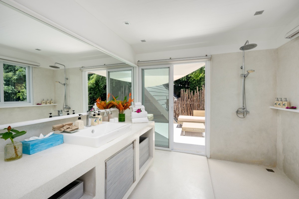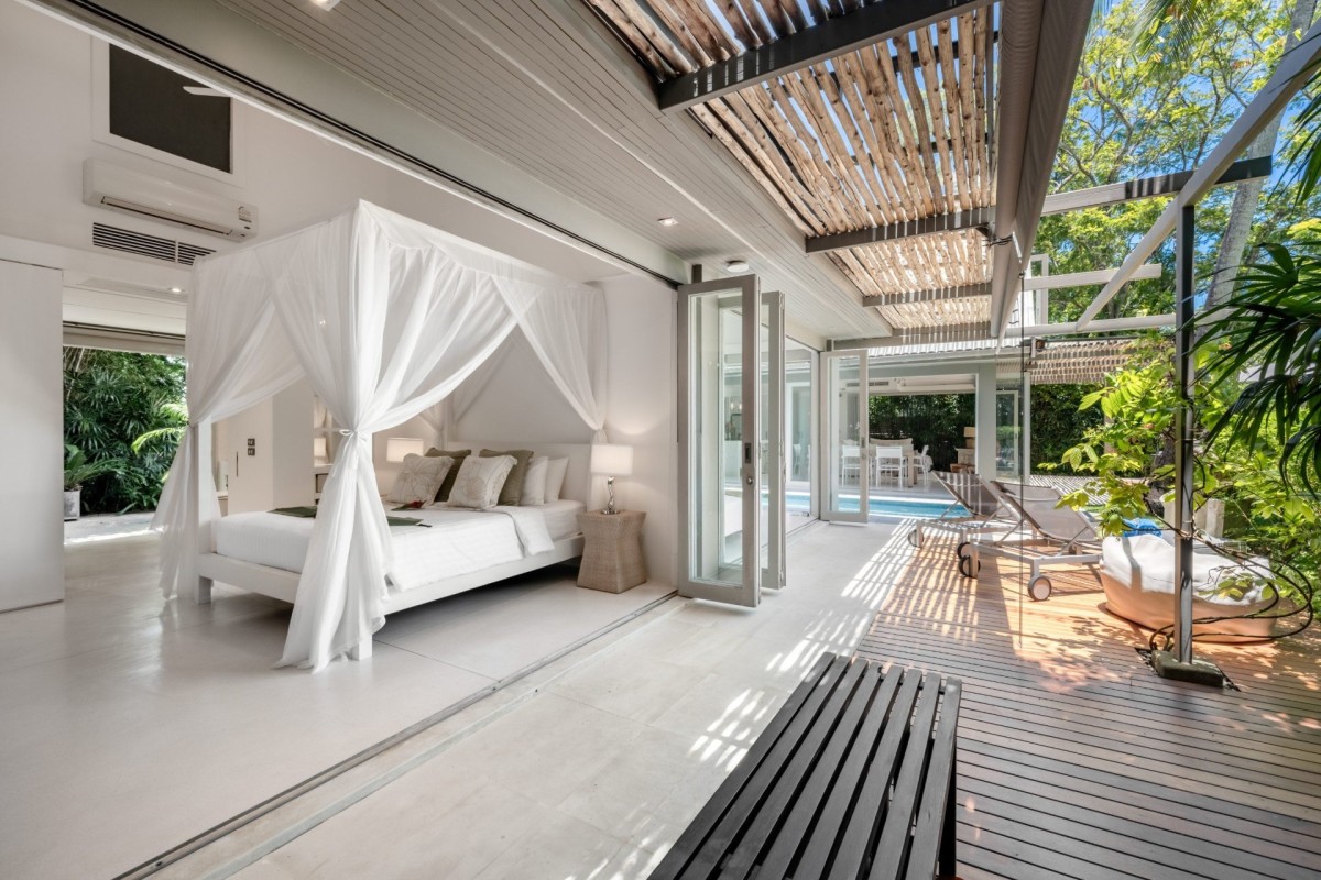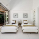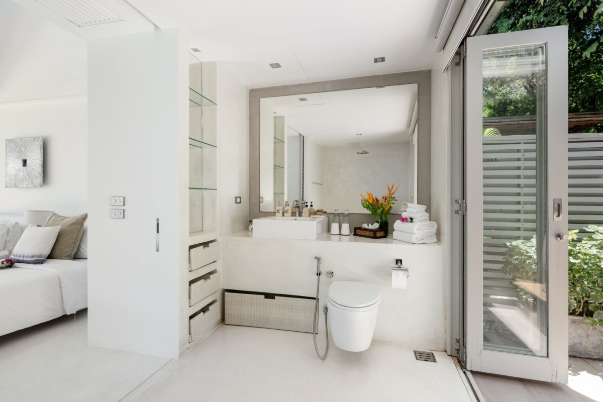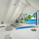 Fully staffed and designed for comfort, the villa features three air-conditioned bedrooms with ensuite bathrooms. Two of the bedrooms open directly onto the pool terrace, while the master suite upstairs offers elevated ocean views and a private rooftop lounge made for sunbathing or stargazing.