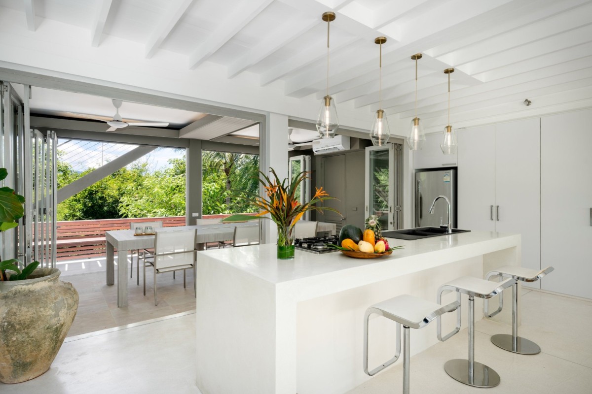 Inside, the villa blends crisp, white interiors with tropical touches, echoing a "Hamptons-meets-island" aesthetic. Designed for seamless indoor-outdoor living, the spaces open wide to let the sea breeze in, creating a calming, effortless flow throughout. From sunrise views over the valley to golden sunsets across the Gulf of Thailand, this hilltop retreat is all about the art of slowing down.