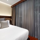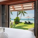 Bedroom 2 (Kokoro): First-floor bedroom with a king-size + single bed, ceiling fan, A/C, TV, WiFi, safe, walk-in closet, sea view, and en-suite bathroom with bathtub, shower, double vanity and WC. 2 adults and 1 child maximum.
