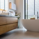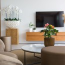 Villa Amylia Ruby caters to discerning travelers in search of a minimalist yet opulent holiday experience, boasting exquisite interiors and modern conveniences complemented by personalized service from the in-villa team and stunning sea views. The custom-made furniture seamlessly integrates with the natural color scheme, creating an atmosphere of tranquility and simplicity. The villa features an outdoor lounge area under a spacious umbrella, and full-width windows blur the line between indoor and outdoor living.