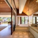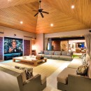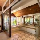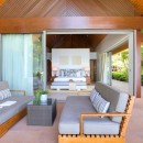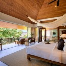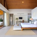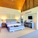 Inside the villa, you'll be captivated by the grand formal dining room, complete with a long wooden table that comfortably seats 16 people and two accompanying swing beds, perfect for pre-dinner drinks or post-meal relaxation. The Master Suite, with its high cathedral ceilings, offers breathtaking views of Lipa Noi Bay and the Five Islands through floor-to-ceiling glass doors leading to a private terrace. The en-suite bathroom features a sunken terrazzo bath and a stunning glass wall separating it from the main bedroom. Additionally, the Master Suite includes a separate air-conditioned room suitable for children or as a day spa massage room.