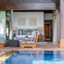 The Beachside Suite embraces the surrounding environment with its glass walls, allowing seamless connection to the pool and the sea. The Garden Suite is enveloped by vibrant green gardens and features an exquisite outdoor bathroom with a sunken tub for stargazing. These suites are perfect for larger families, with an adjoining garden and an interconnecting and lockable door. The two Mezzanine Suites, situated by the garden, offer a charming two-story layout with white wood vaulted ceilings and vibrant colors. The upper level of each suite is ideal for children over 8 years old, young adults, or friends, featuring an attic-style stairwell for added adventure. Guests can also choose to sleep downstairs on mattresses from the upper level.