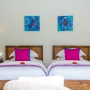 Bedroom First-floor bedroom with two twin beds(can be converted into king-size bed), ceiling fan, A/C, TV, WiFi, balcony, safe, and en-suite bathroom with shower, double vanity, and WC. 2 guests maximum