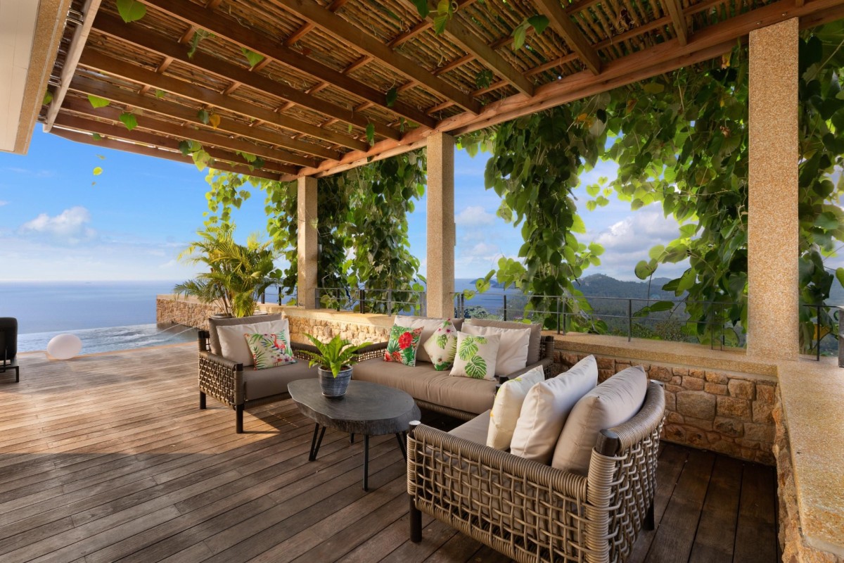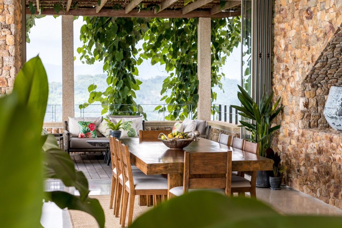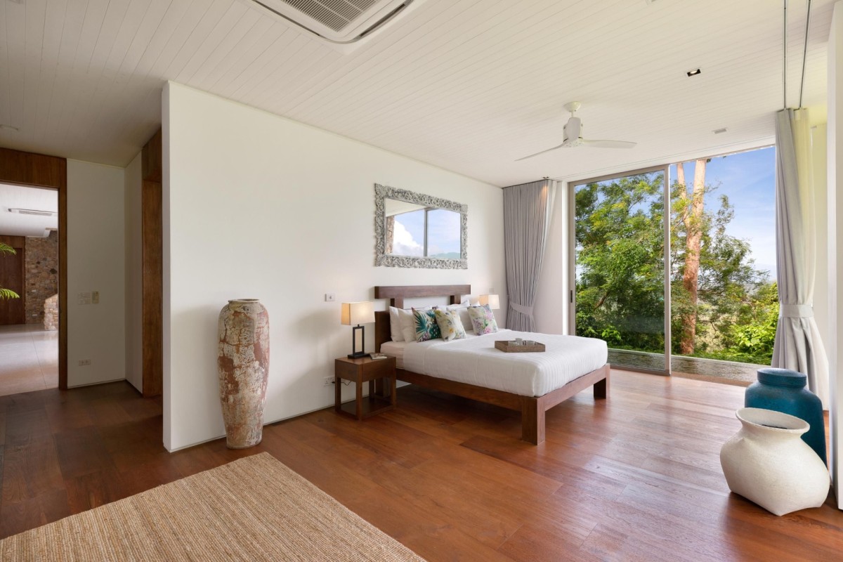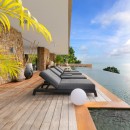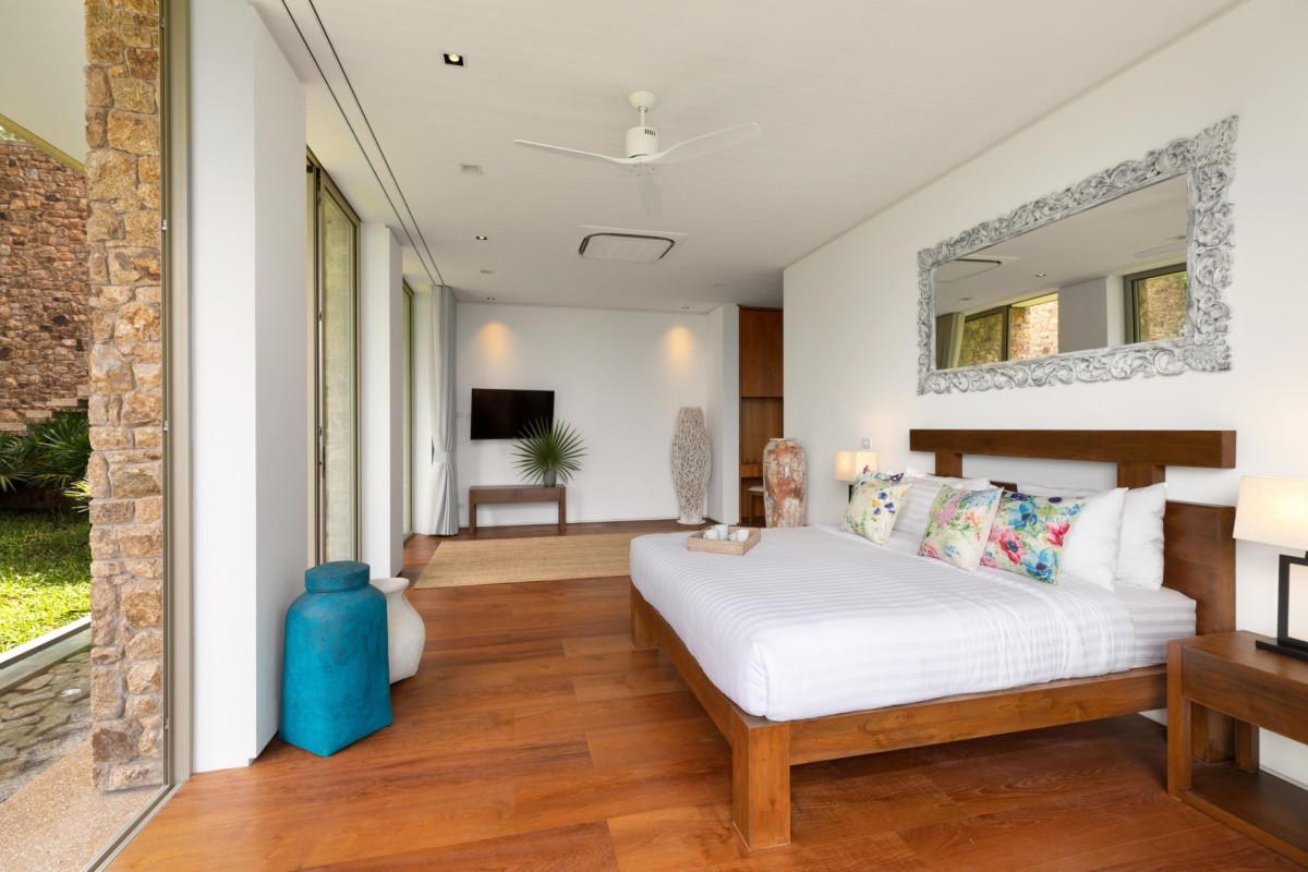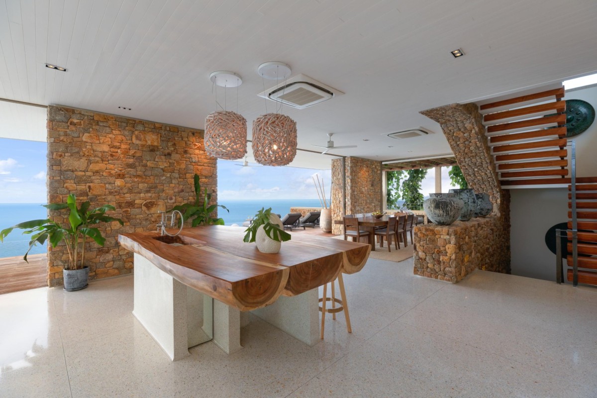 The villa's interiors are a timeless fusion of contemporary coastal style and traditional Thai elegance. Natural materials like granite, teak, and pebble wash echo the beauty of the surrounding landscape. Spread across two levels, every room and living space is designed to maximise stunning ocean views and lush tropical landscaping.