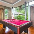 As you arrive, a grand entrance welcomes you, adorned with a serene pond and tropical garden. Step through the ornate, hand-carved wooden door from Chiang Mai and be greeted by the spacious and opulent living area. Designed to accommodate large groups of family or friends, the indoor living room features a pool table and a dining space for ten, inviting shared moments of laughter and connection.