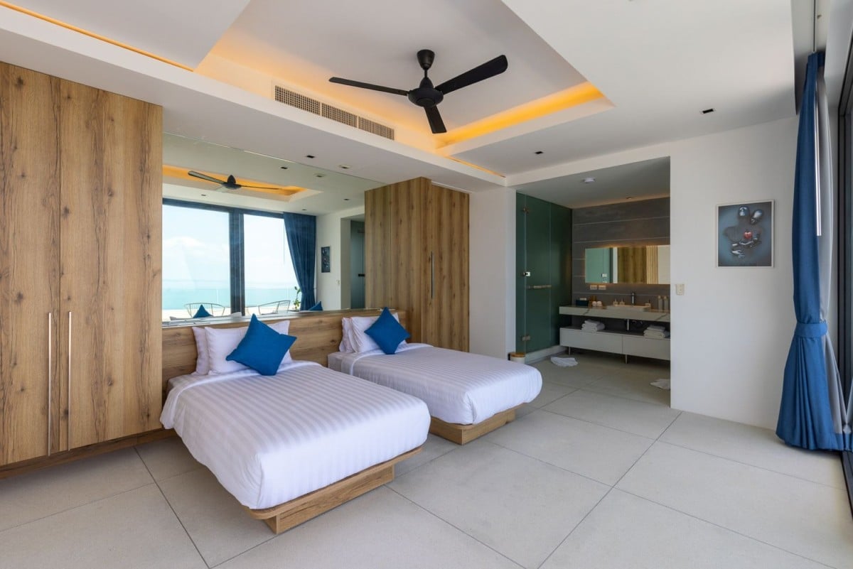 Bedroom 2: Second floor Bedroom with two single beds (can be made up as a king-size bed), WiFi, A/C, ceiling fan, safe, ocean view, en-suite bathroom with rain shower, vanity, and WC. 2 guests maximum