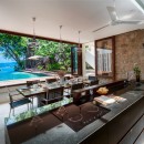 As you step outside, you'll be greeted by the sight of the L-shaped infinity-edge swimming pool, fringed by lush gardens, inviting you to take a refreshing dip or simply bask in the sun-kissed surroundings. Adjacent to the pool, an open-air living room awaits, featuring a stylish bar and comfortable sofas where you can unwind and enjoy the company of your loved ones. The elegant dining room, adorned with exquisite furnishings, boasts a large dining table that can accommodate up to eight guests, perfect for memorable meals together. A fully equipped kitchen complements the dining area, allowing you to prepare delicious meals at your convenience.