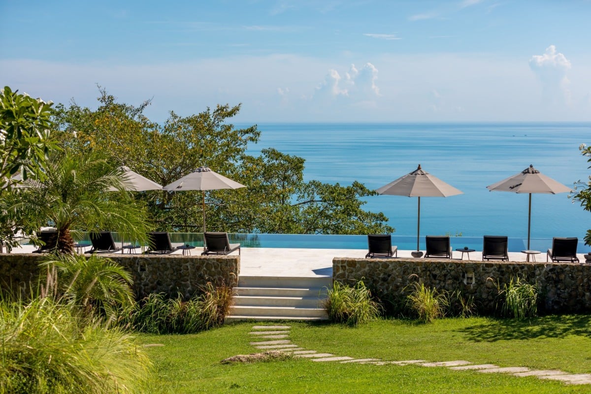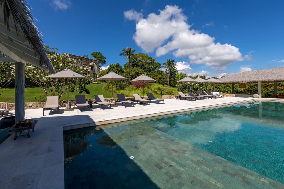 The expansive infinity pool sits at the centre of the gardens, sunken into a wooden deck and offering exceptional sea views. It is surrounded by sun loungers, shaded seating areas, a pool bar, and a covered lounge, making it the perfect place to relax or gather as a group. Bluetooth speakers are discreetly placed around the pool and buildings, allowing guests to enjoy their own music with ease.