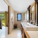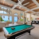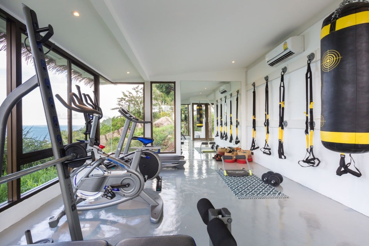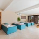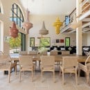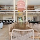 Upstairs, a mezzanine library and business centre offers a quiet retreat, featuring reclaimed teak floors, bespoke furnishings, and walls lined with books. Below the main pavilion, a flexible multi-purpose room can be used as a TV lounge, massage room, or additional recreational space.