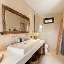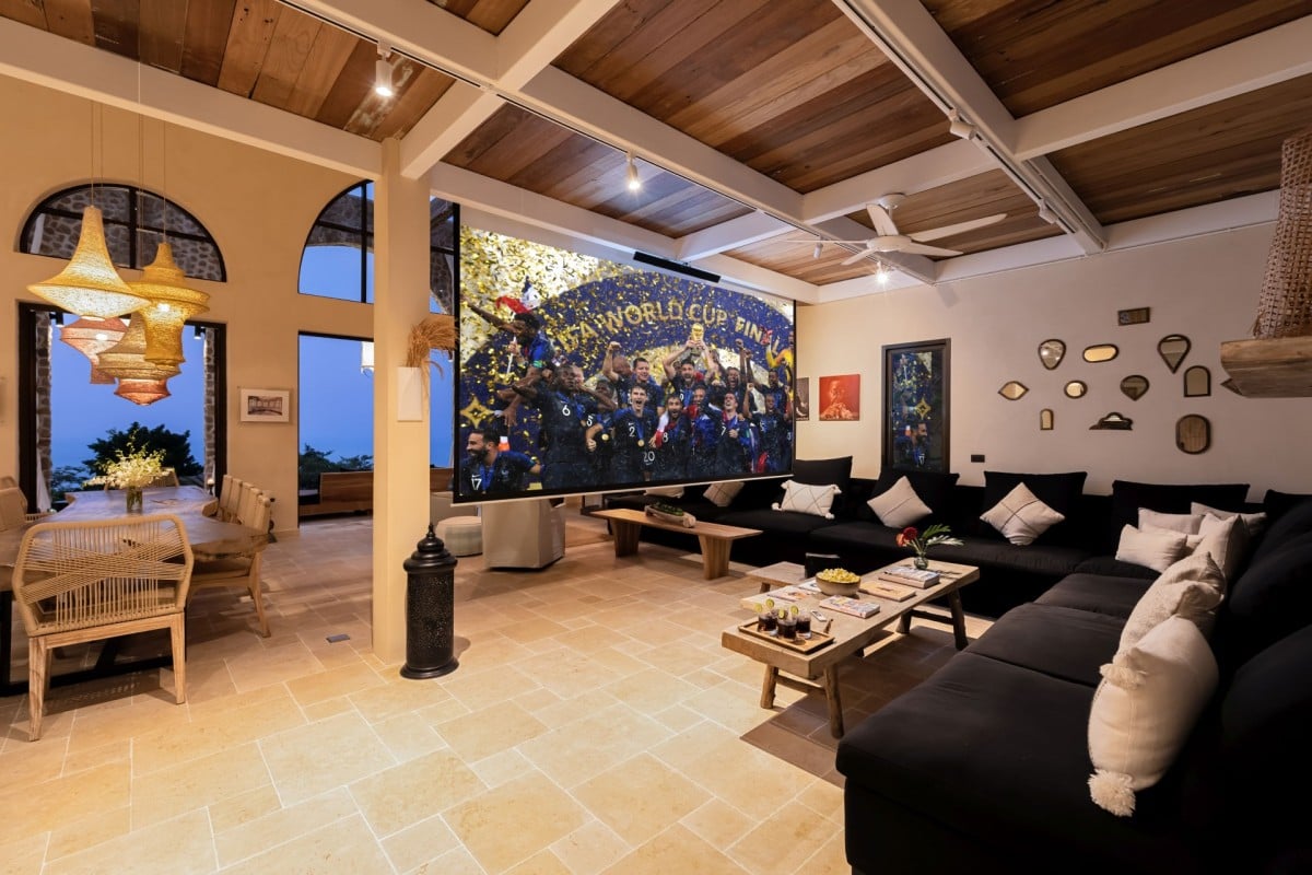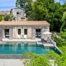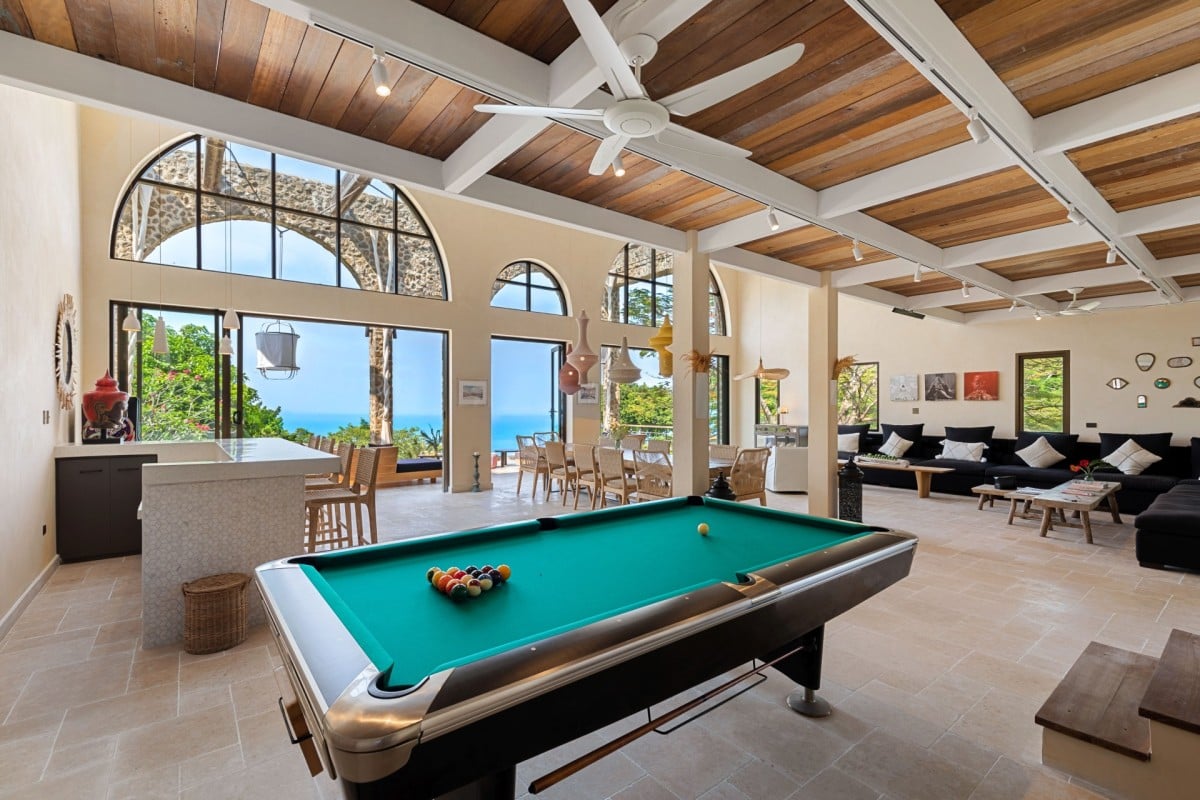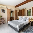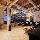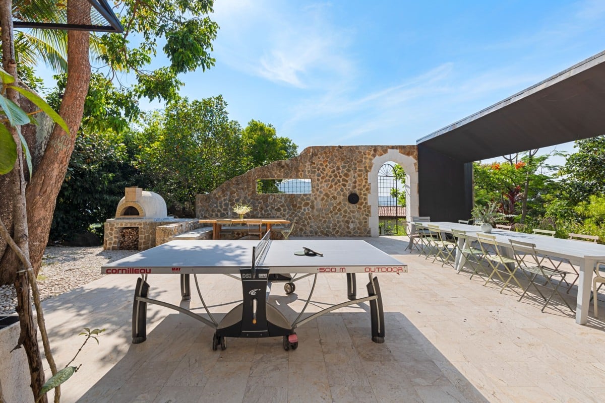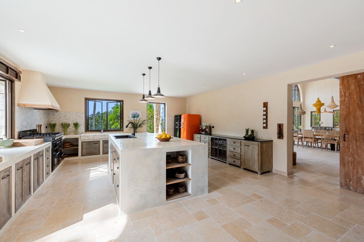 At the heart of the estate is the main living pavilion, home to expansive communal spaces ideal for social gatherings and celebrations. The open-plan living and dining area is a double-height space furnished with oversized sofas, curated art pieces, and a solid aged-wood dining table seating up to 18 guests. A built-in bar, pool table, football table, and dartboard enhance the relaxed, sociable atmosphere, while the adjoining country-style kitchen is fully equipped with Smeg appliances and serves as the creative hub for the in-house chef.