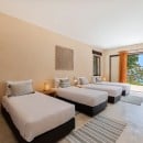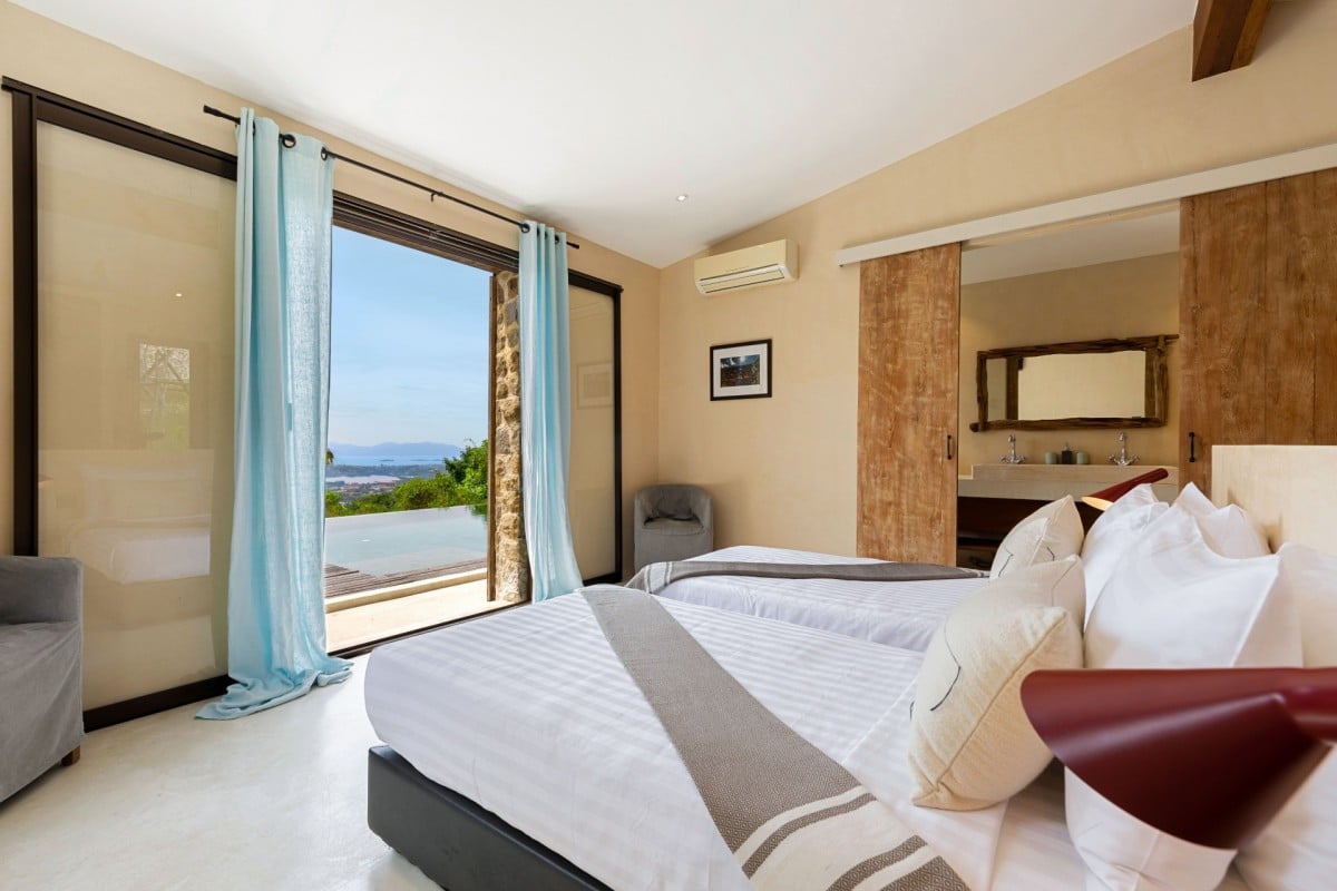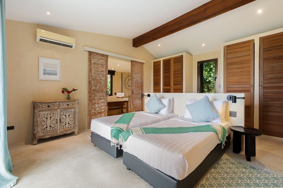 Bedroom 6: Bedroom with two single beds, WiFi, A/C, safe, ocean view, connected with bedroom 5, en-suite bathroom with rain shower, vanity, and WC. 2 guests maximum