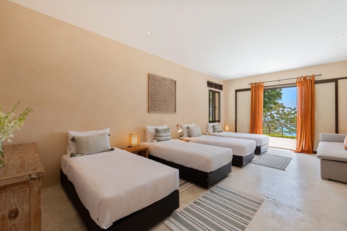 Bedroom 8: Kids Bedroom with four single beds, WiFi, A/C, safe, ocean view, en-suite bathroom with rain shower, vanity, and WC. 4 kids maximum