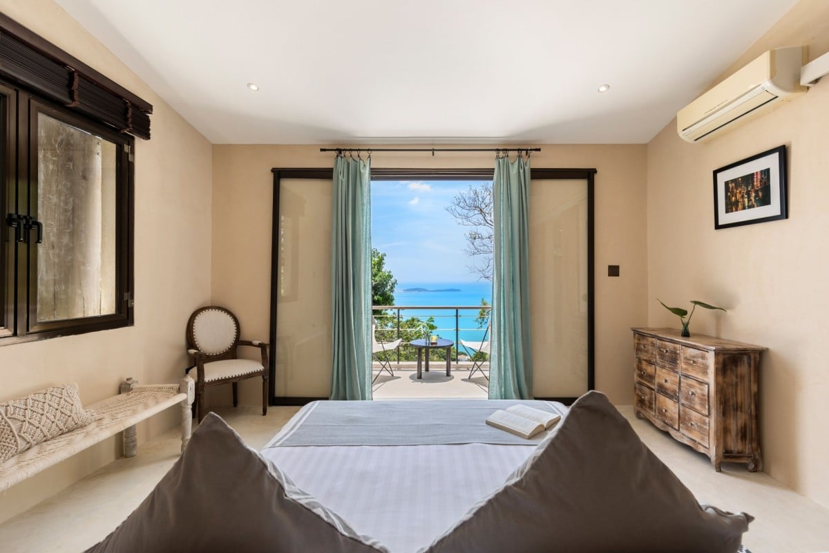 Bedroom 5: Bedroom with a queen-size bed, WiFi, A/C, safe, ocean view, connected with bedroom 6, en-suite bathroom with rain shower, vanity, and WC. 2 guests maximum