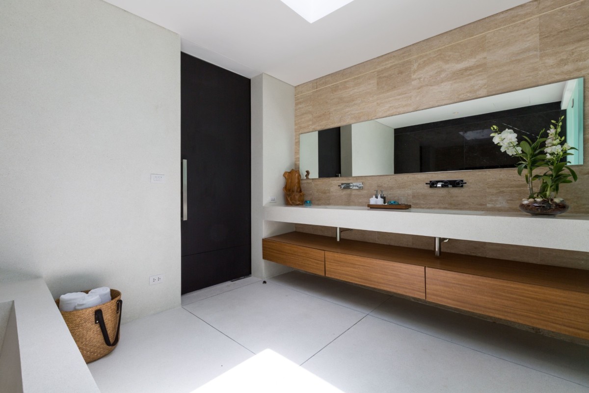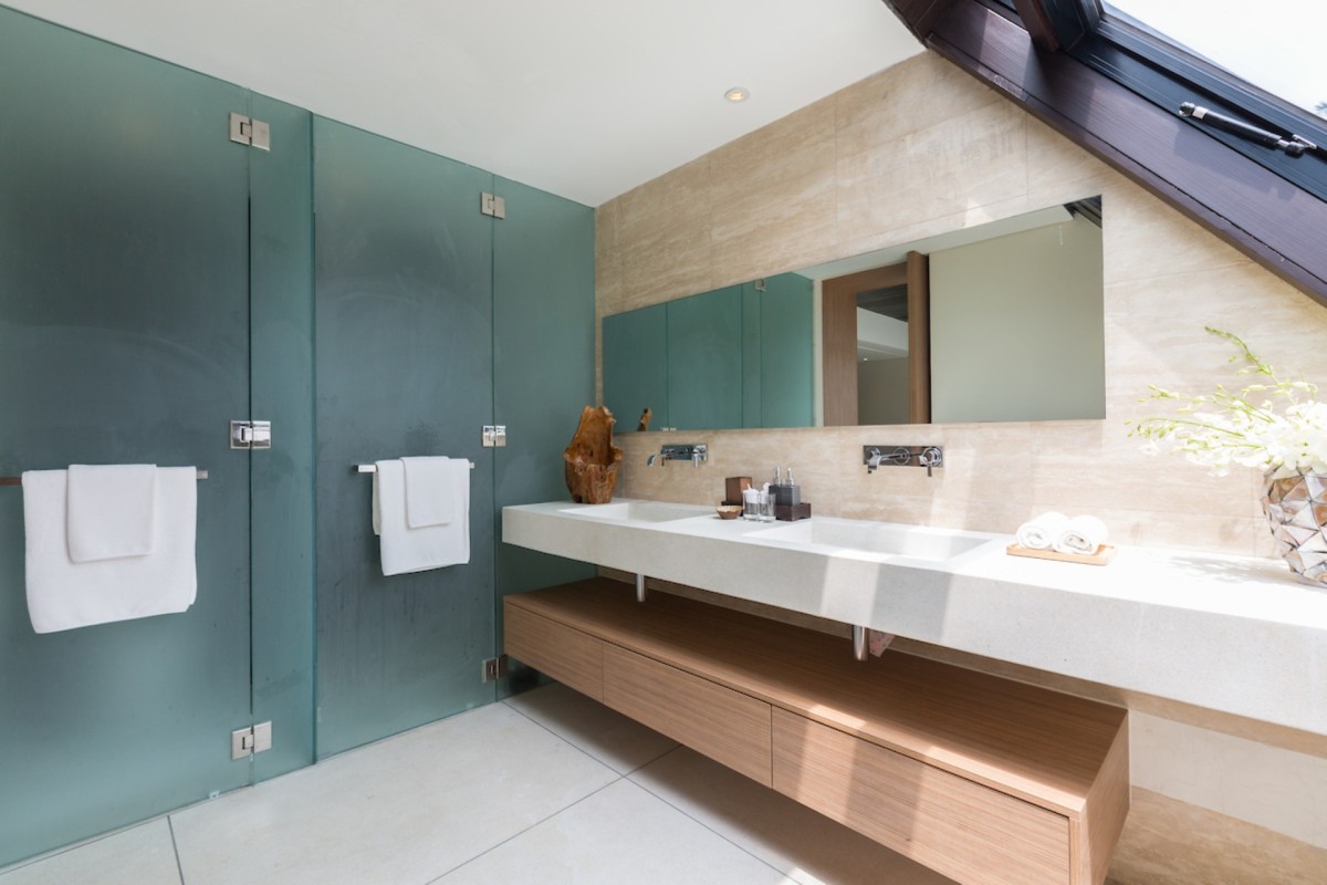 All five adult bedrooms are beautifully appointed, each with a king-size bed dressed in crisp white linens and a luxurious en-suite bathroom. The soothing sound of the ocean accompanies restful nights throughout the villa. The master suite, located in the main pavilion, boasts stunning ocean views, while the adjacent bedroom enjoys partial sea views. Upstairs, another oceanfront bedroom takes full advantage of its elevated position.