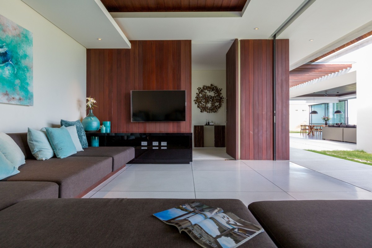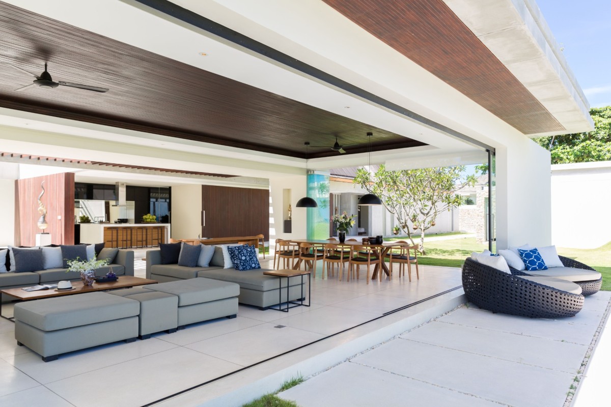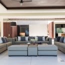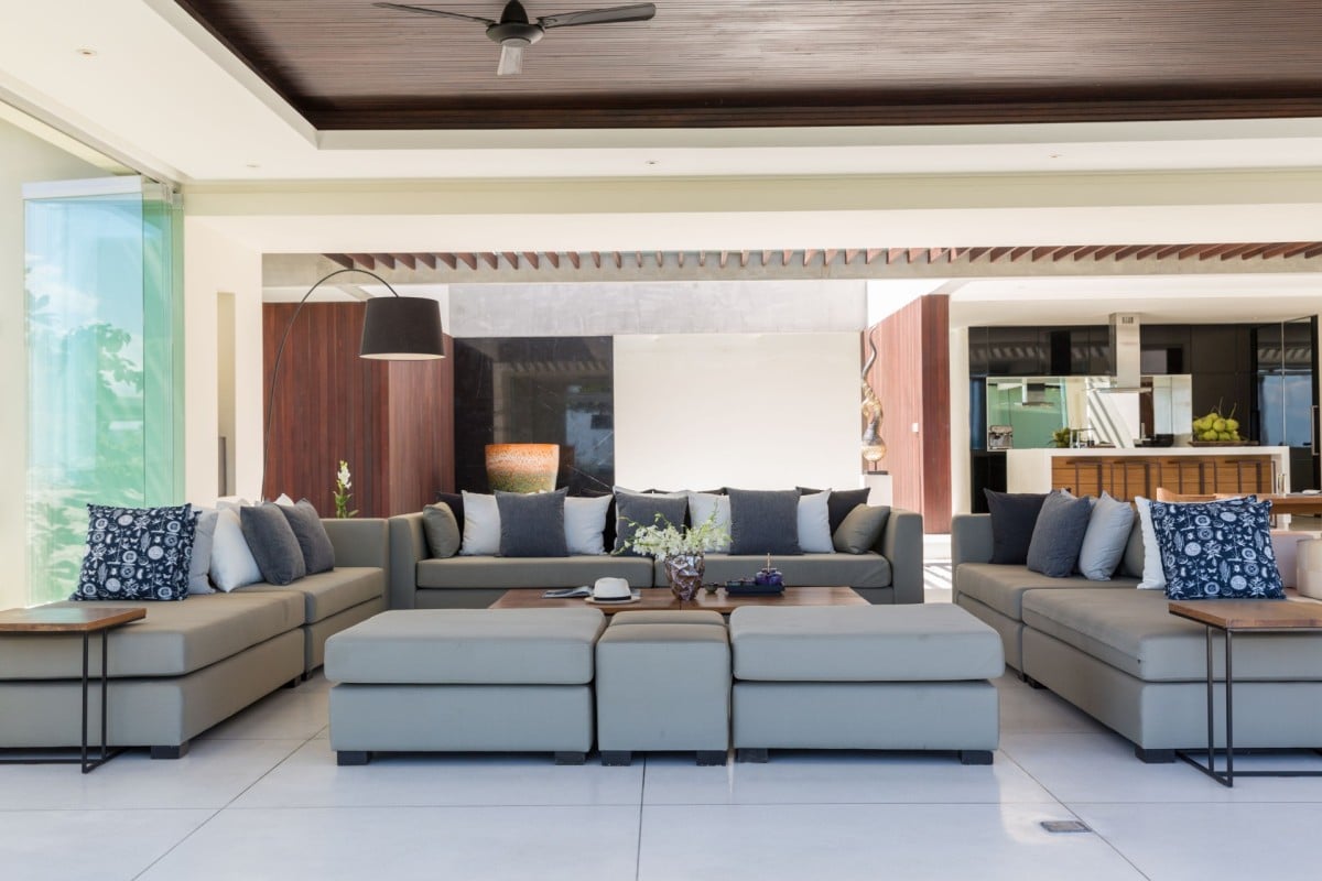 At the heart of the villa is the main living pavilion, where panoramic sea views steal the show. Deep, inviting sofas are perfectly positioned for morning coffee or sunset cocktails, while wraparound windows invite cooling ocean breezes throughout the day.