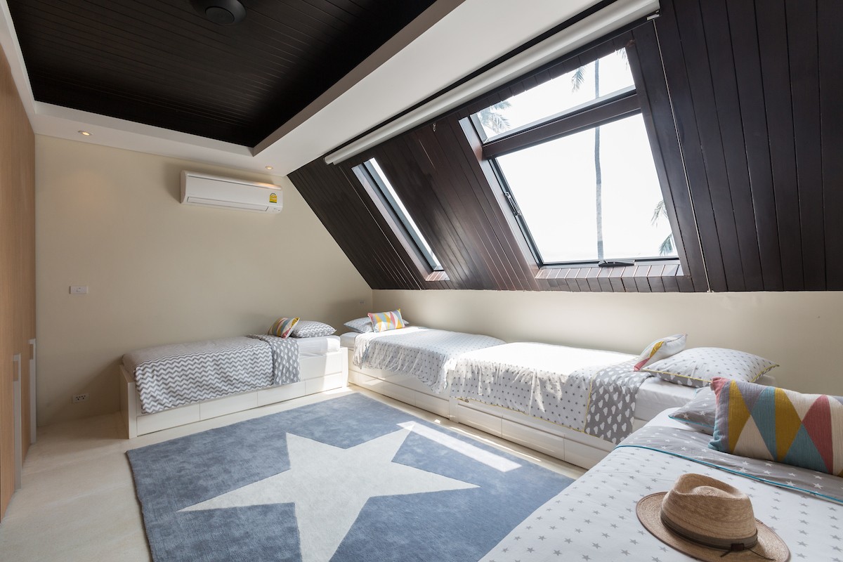 Bedroom 5: Upper floor Kids bedroom with two bunk beds, WiFi, A/C, en-suite bathroom with shower, vanity, and WC. 4 kids maximum