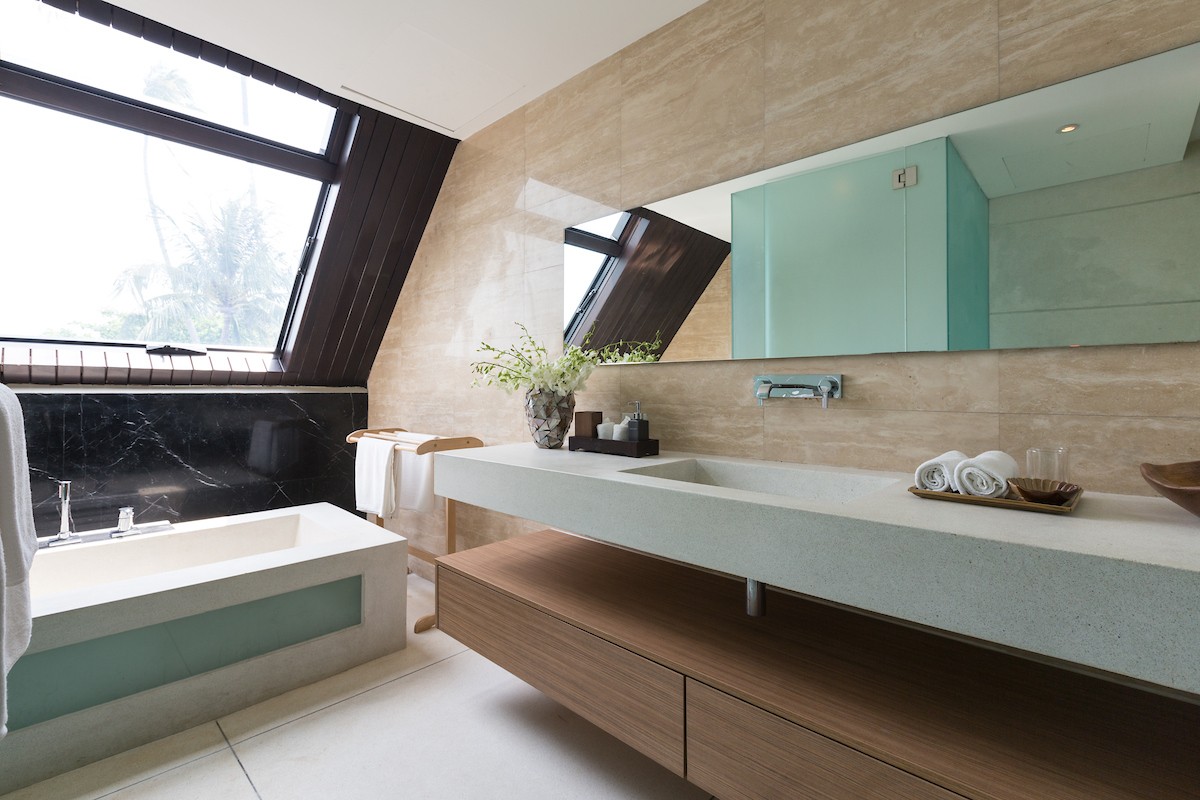 Outdoors, the villa is just as impressive. Cool off in the sparkling infinity pool, relax on the sun-drenched lawn dotted with palm trees, or step directly onto the beach just moments from your door. As evening falls, gather in the poolside sala or sunken lounge, where sunset drinks and freshly grilled seafood from the outdoor kitchen create unforgettable tropical evenings.