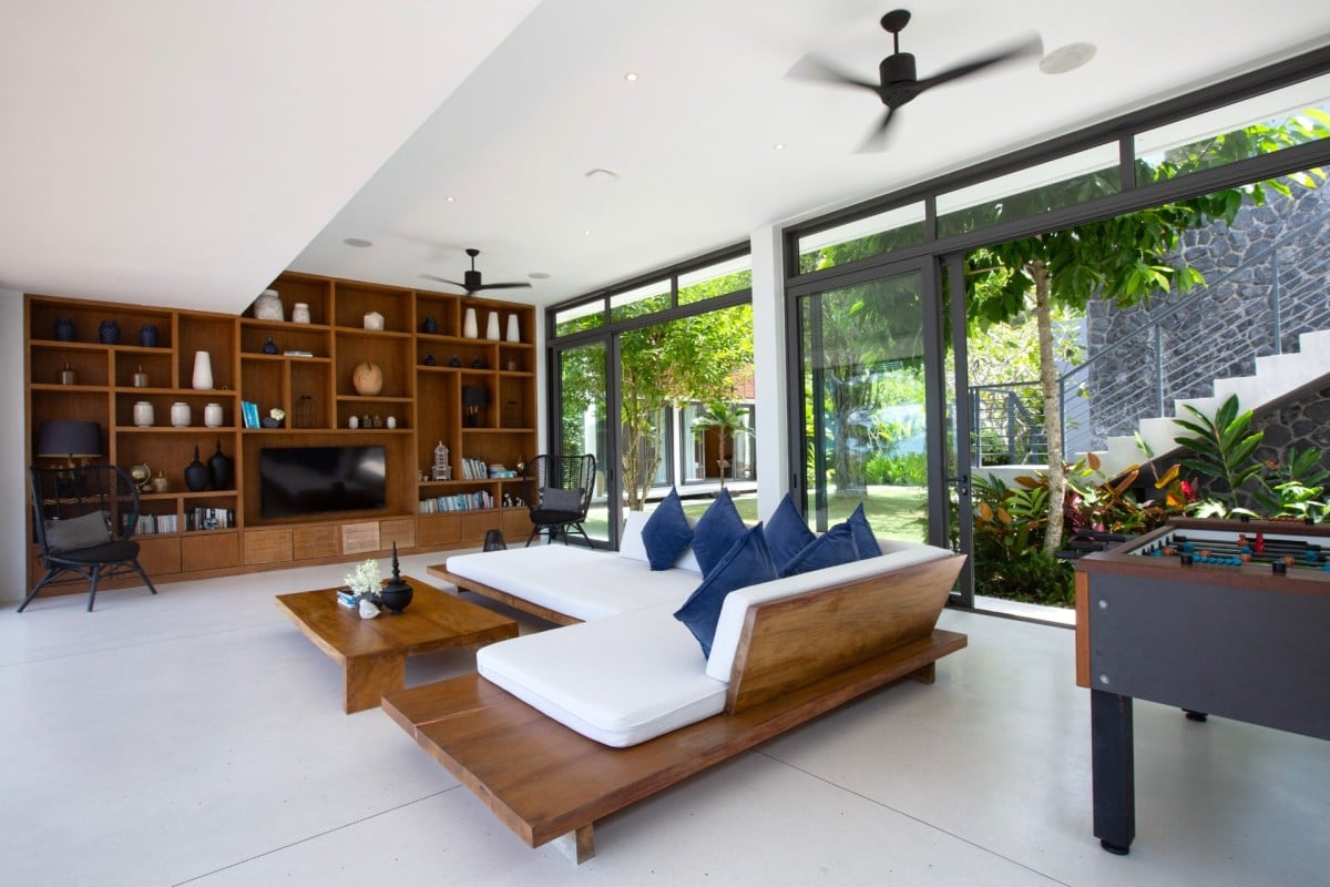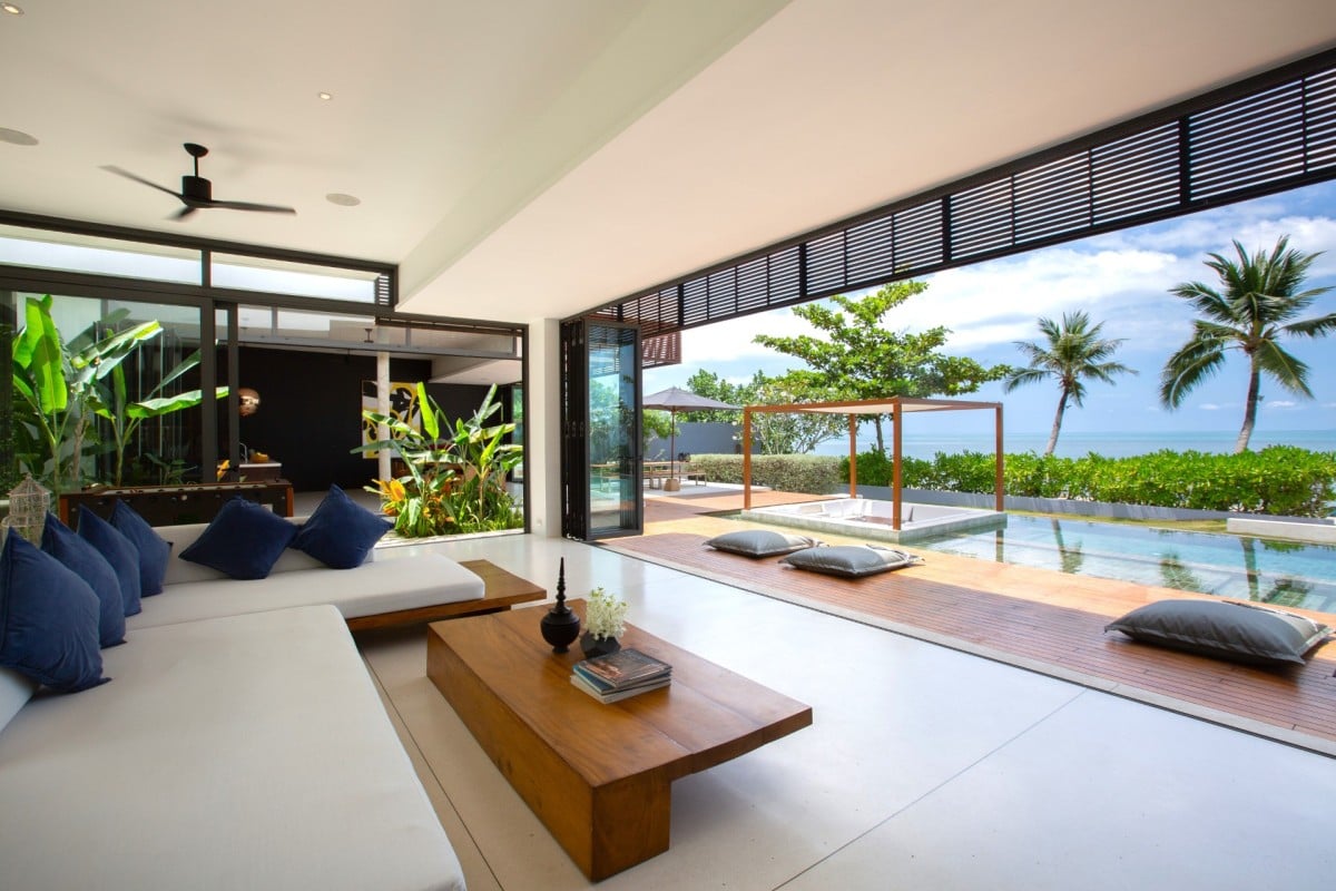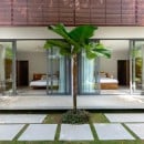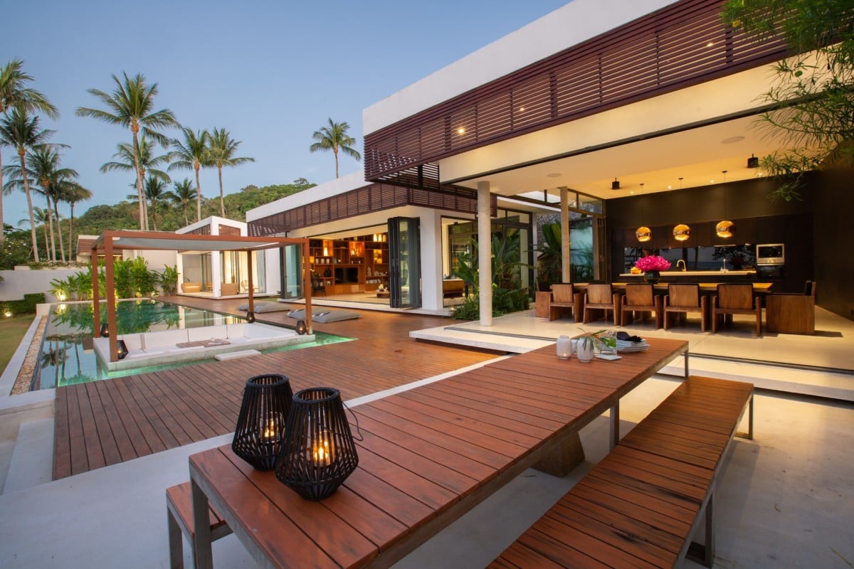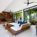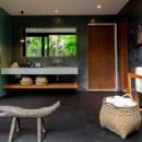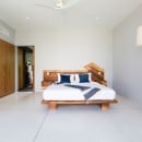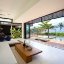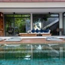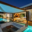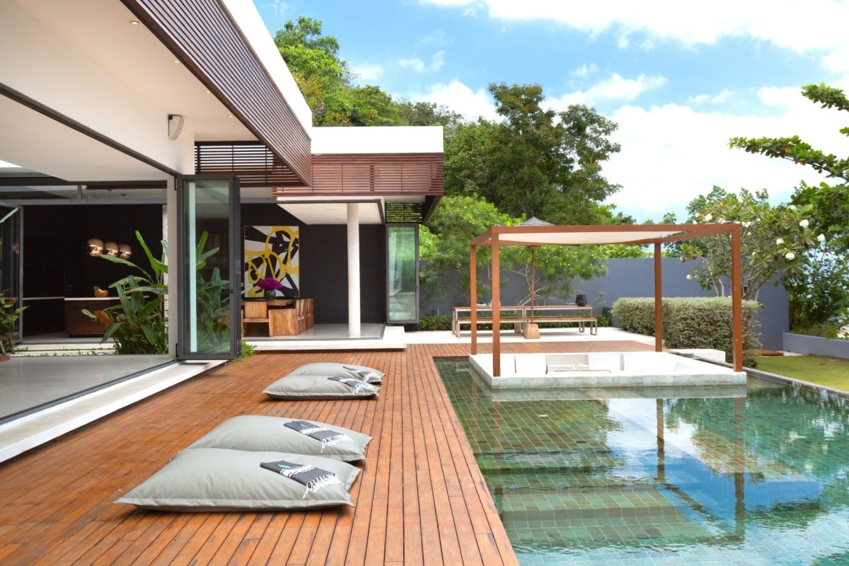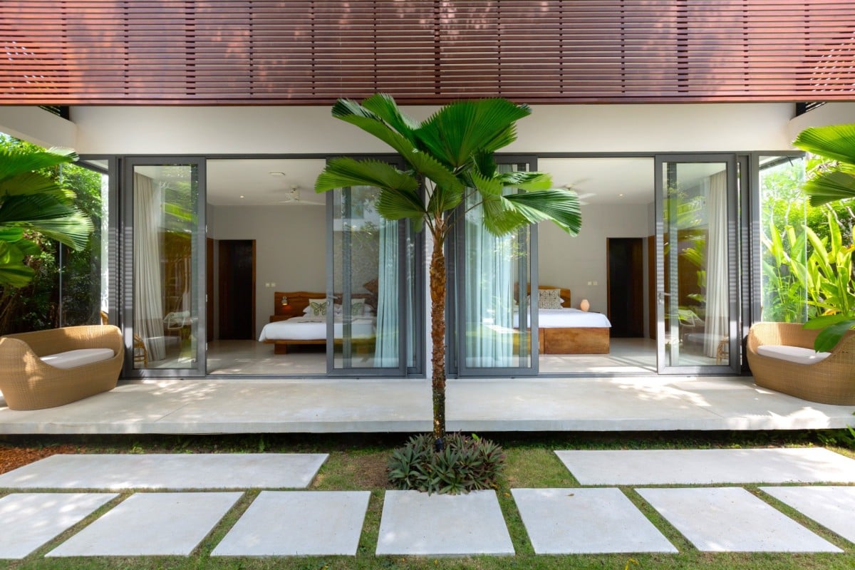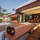 Hidden behind oversized wooden doors, the villa opens into a lush tropical garden filled with frangipani and bird of paradise. Inspired by Japanese Zen and mid-century modern architecture, Villa Malouna is thoughtfully designed to blend with its natural surroundings. Open-plan pavilions, cooling sea breezes, and refined interiors featuring teak wood and terrazzo create a sense of understated luxury and serenity.