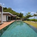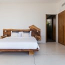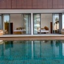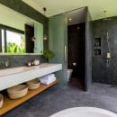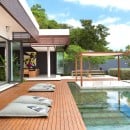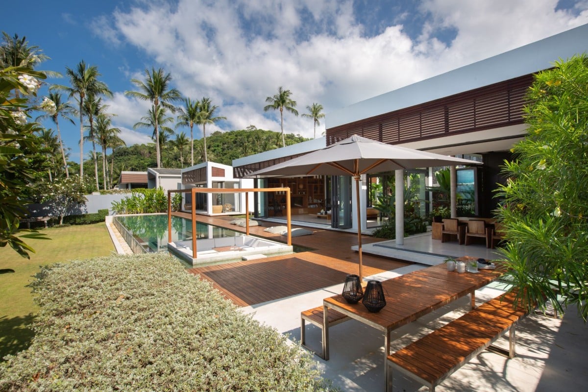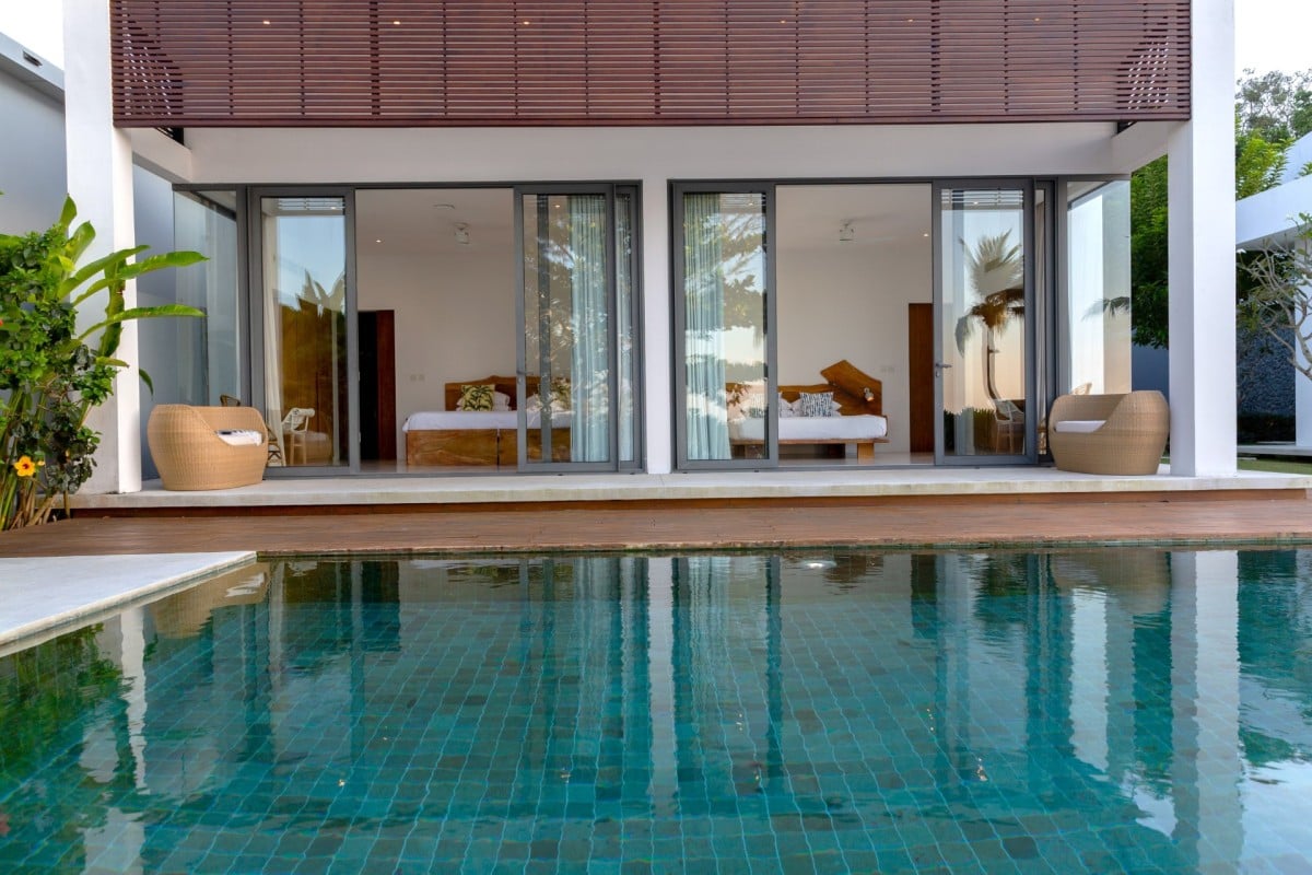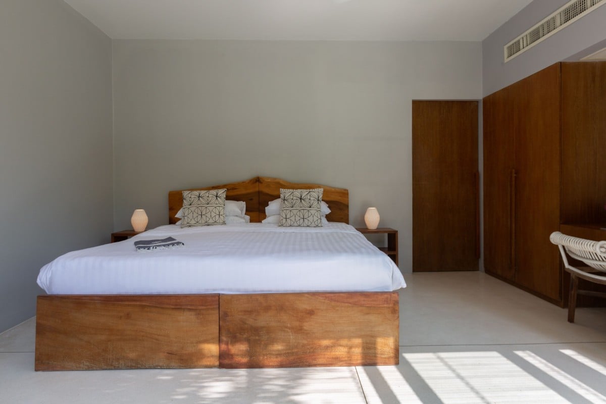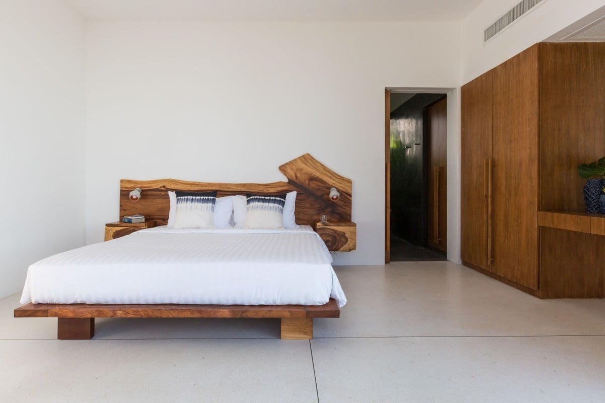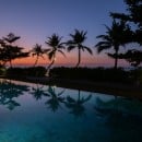 Hidden behind oversized wooden doors, the villa opens into a lush tropical garden filled with frangipani and bird of paradise. Inspired by Japanese Zen and mid-century modern architecture, Villa Malouna is thoughtfully designed to blend with its natural surroundings. Open-plan pavilions, cooling sea breezes, and refined interiors featuring teak wood and terrazzo create a sense of understated luxury and serenity.