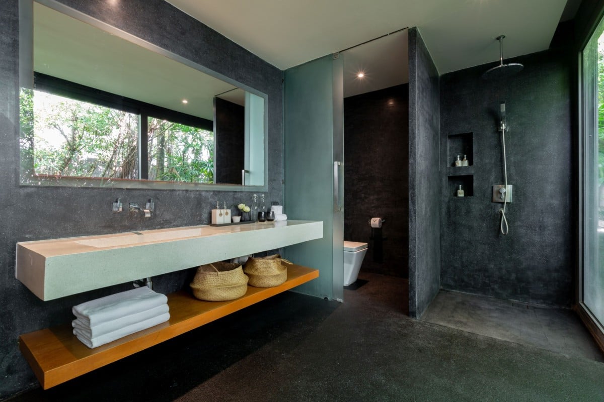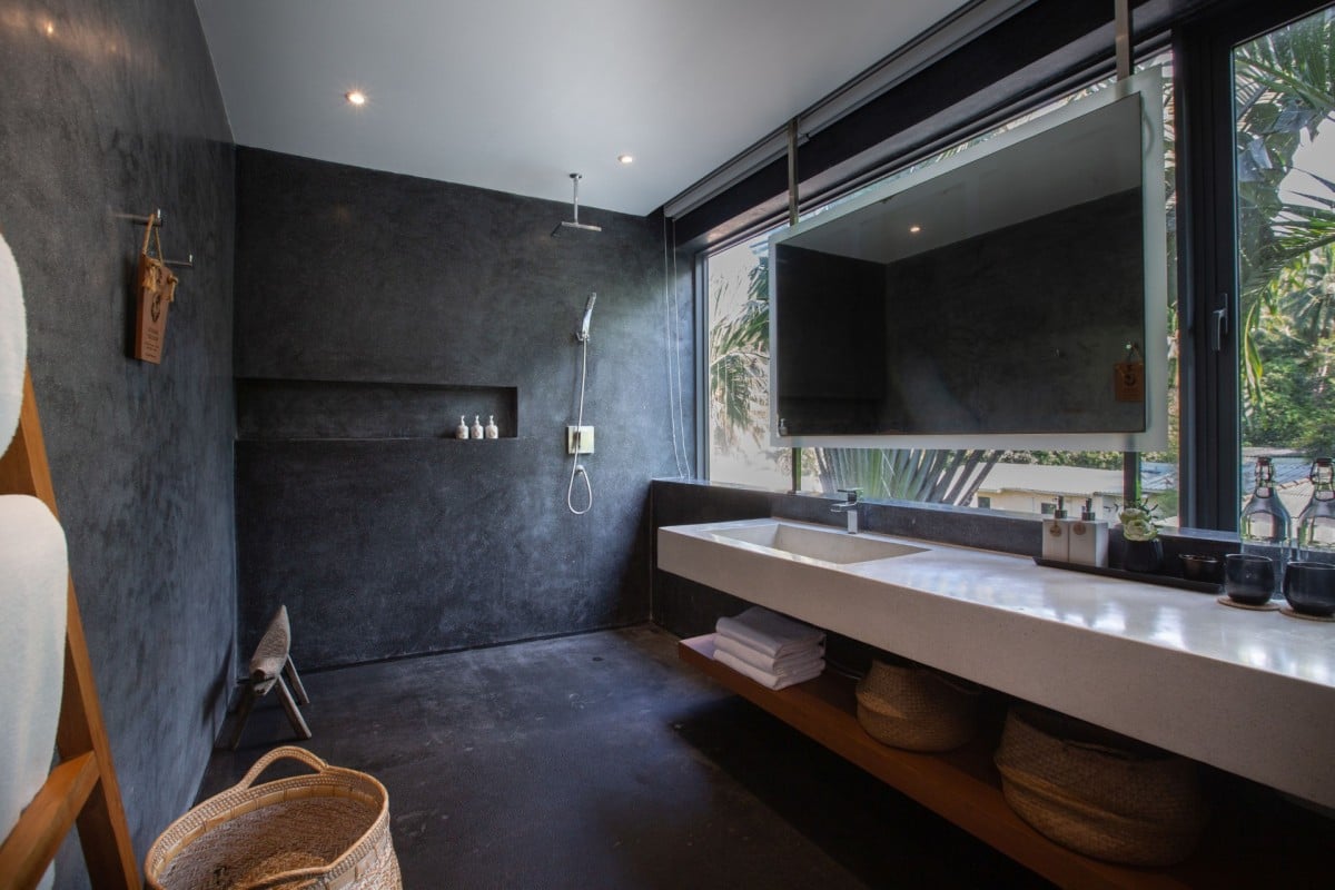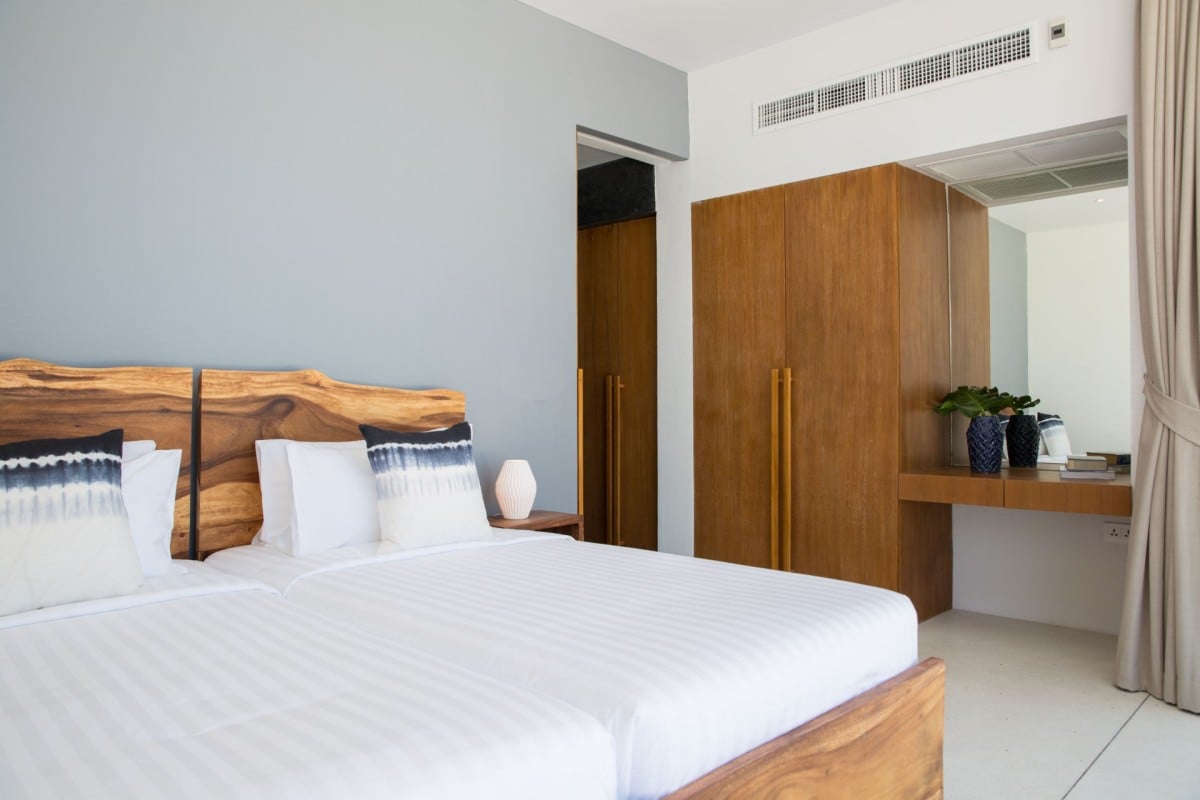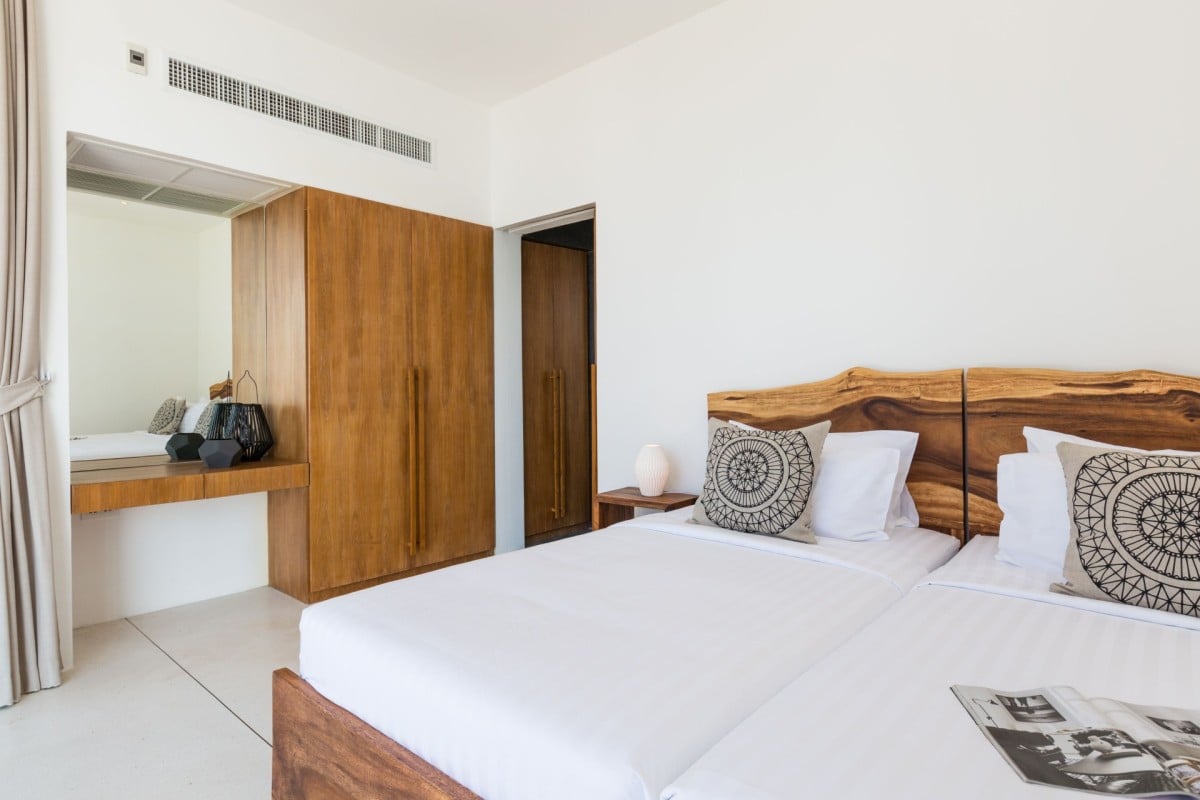 Bedroom 5: Bedroom with two single beds (can be made up as a king-size bed), WiFi, A/C, ceiling fan, safe, individual lush tropical garden, pool view, en-suite bathroom with shower, vanity, and WC. 2 guests maximum