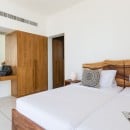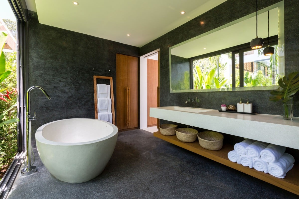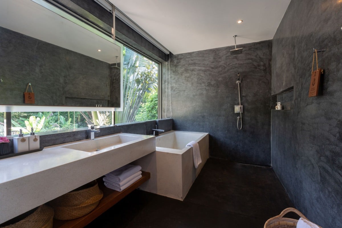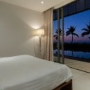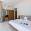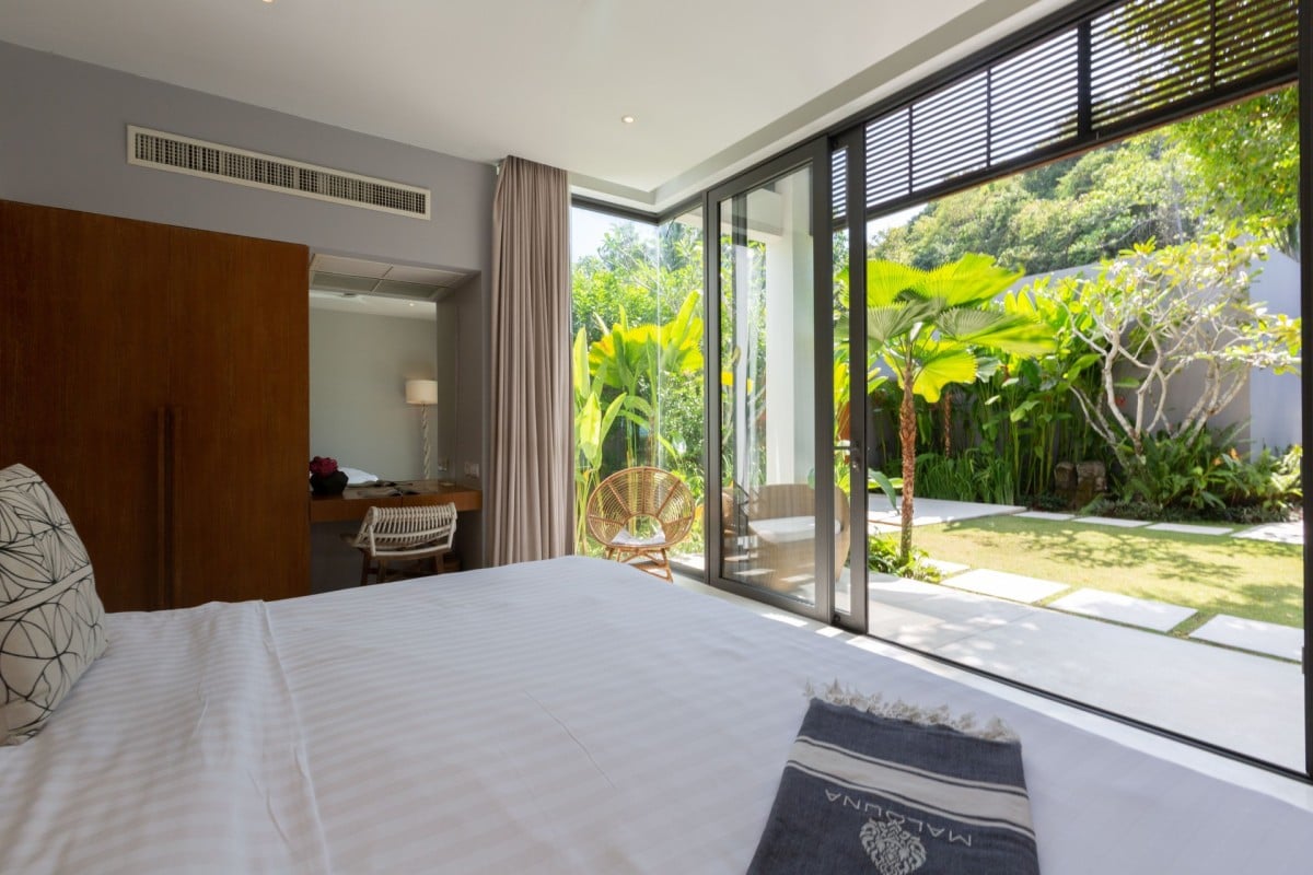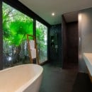 Bedroom 6: Bedroom with a king-size bed, WiFi, A/C, ceiling fan, safe, individual lush tropical garden, pool view, en-suite bathroom with bathtub, shower, vanity, and WC. 2 guests maximum