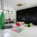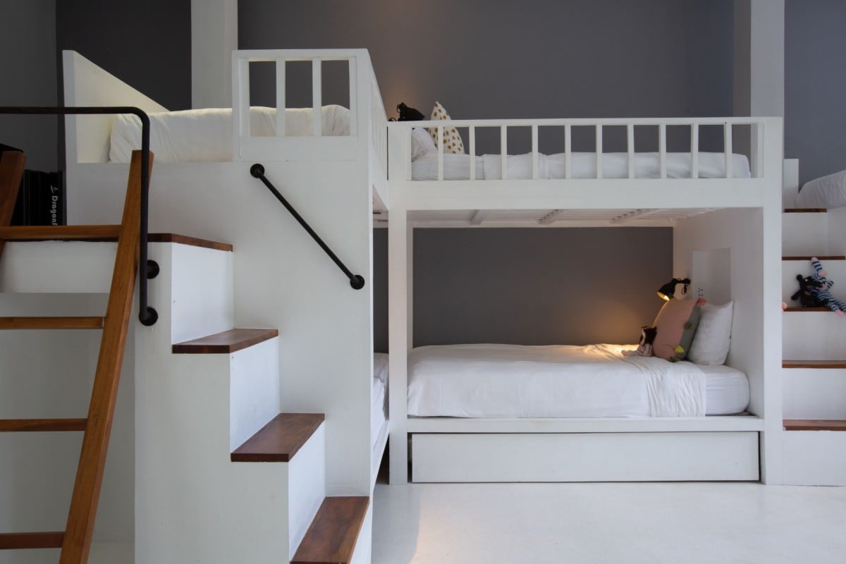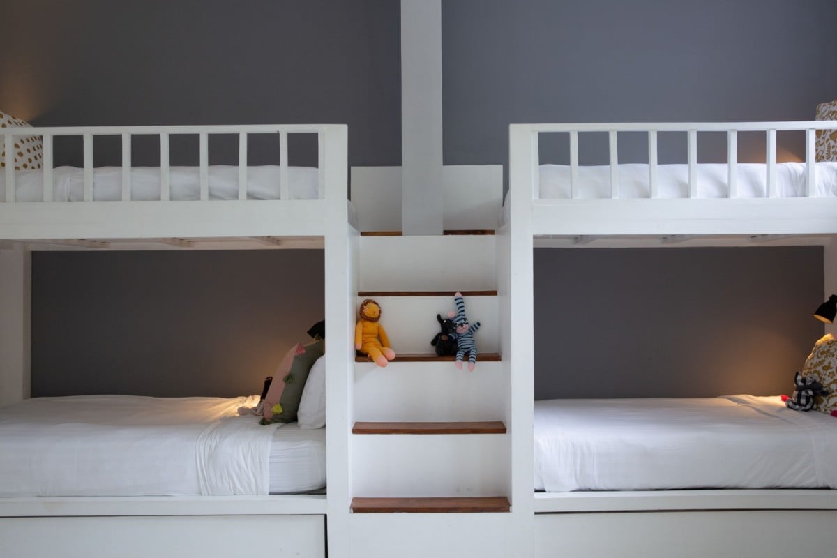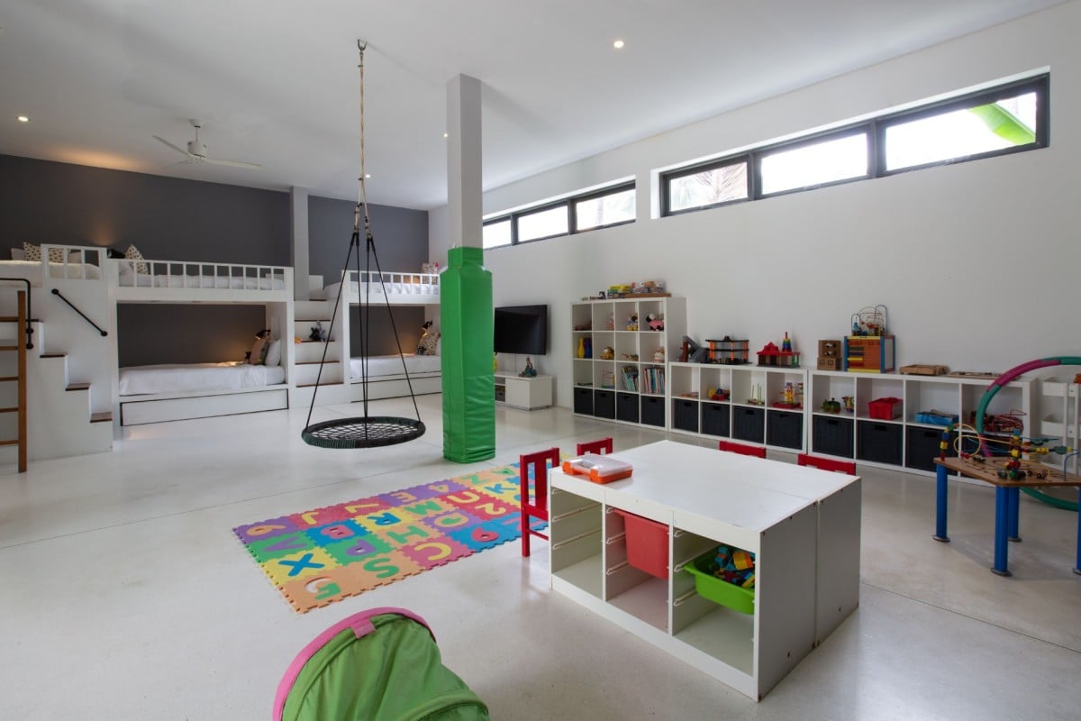 Bedroom 7: Kids bedroom with two bunk beds, and two single beds, WiFi, A/C, ceiling fan, TV, video game consoles, safe, individual lush tropical garden, pool view, en-suite bathroom with bathtub, shower, vanity, and WC. 6 kids maximum