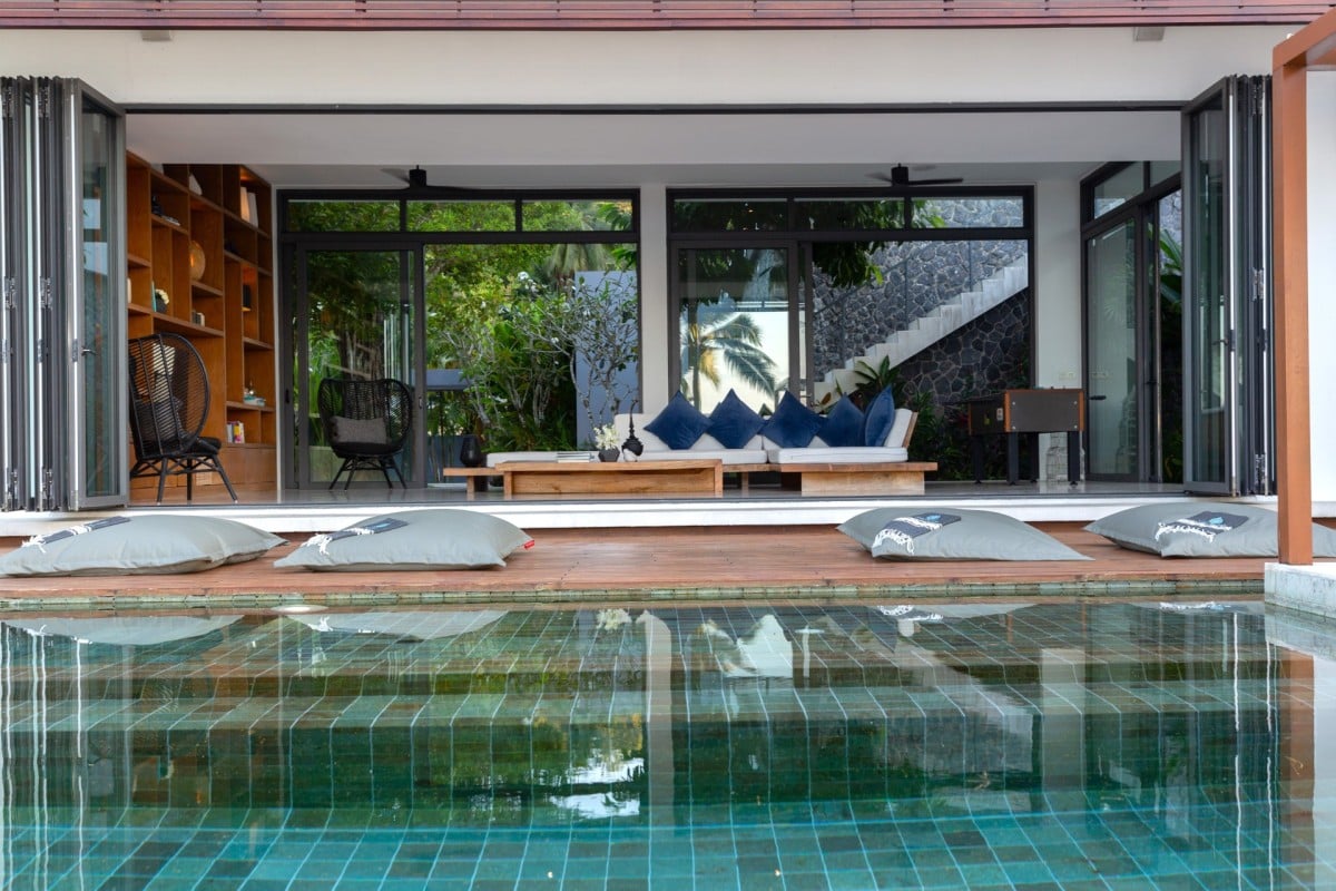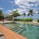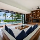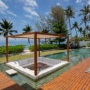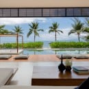 The centerpiece is a 27-meter infinity pool lined with Sukabumi stone, overlooking the beach and lagoon, with ample deck space for lounging, reading, or sunset cocktails. Separate living and dining pavilions include a fully equipped kitchen, media system, and space for private dining experiences prepared by the in-house chef.