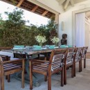 The open-plan living room is adorned with bright decor, featuring a comfortable lounge area with a long sofa, lounger, and rocking chair around a coffee table and a large LCD TV. A stylish dining area with a 12-seater table sits in the middle of the room, complemented by a luxury-fitted kitchen equipped with Smeg appliances, including a built-in espresso machine. The living space seamlessly extends to the veranda, offering additional lounge and dining sets.