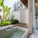Bedroom 3: Bedroom with a king-size bed, ceiling fan, A/C, TV, WiFi, safe, pool view, and en-suite bathroom with outdoor bathtub, shower, vanity and WC. 2 guests maximum.