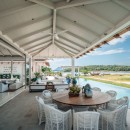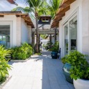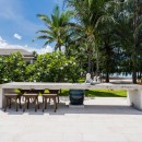The lofty ceilings and sizable glass doors foster airflow and a feeling of spaciousness, immersing you in the lush tropical surroundings. Enjoy open-air dining at the rounded outdoor table, ideal for socializing.