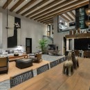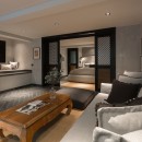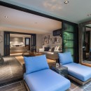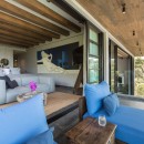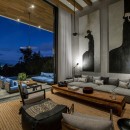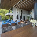 The main villa spans two floors and 400 square meters, featuring a uniquely designed, open-plan lounge with impressive teak-beamed ceilings reaching six meters high. The grand living area encompasses the kitchen, dining space, and a luxurious lounge, all fronted by floor-to-ceiling sliding glass doors leading to a magnificent terrace. The terrace hosts a 14 by 3.5-meter infinity pool with jacuzzi jets, surrounded by hardwood exterior furniture, including sunbeds, sofa sets, and a dining table for up to 12 guests.