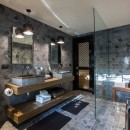 Approached through a private driveway, Villa Orca's striking hillside location is accentuated by an ornate black-lacquered steel and opaque glass entrance door, with parking available for three cars. The villa comprises the main house with four bedrooms and a standalone bungalow housing the fifth and master bedroom.