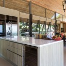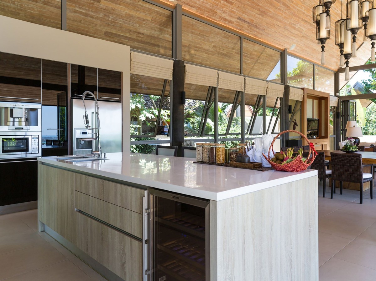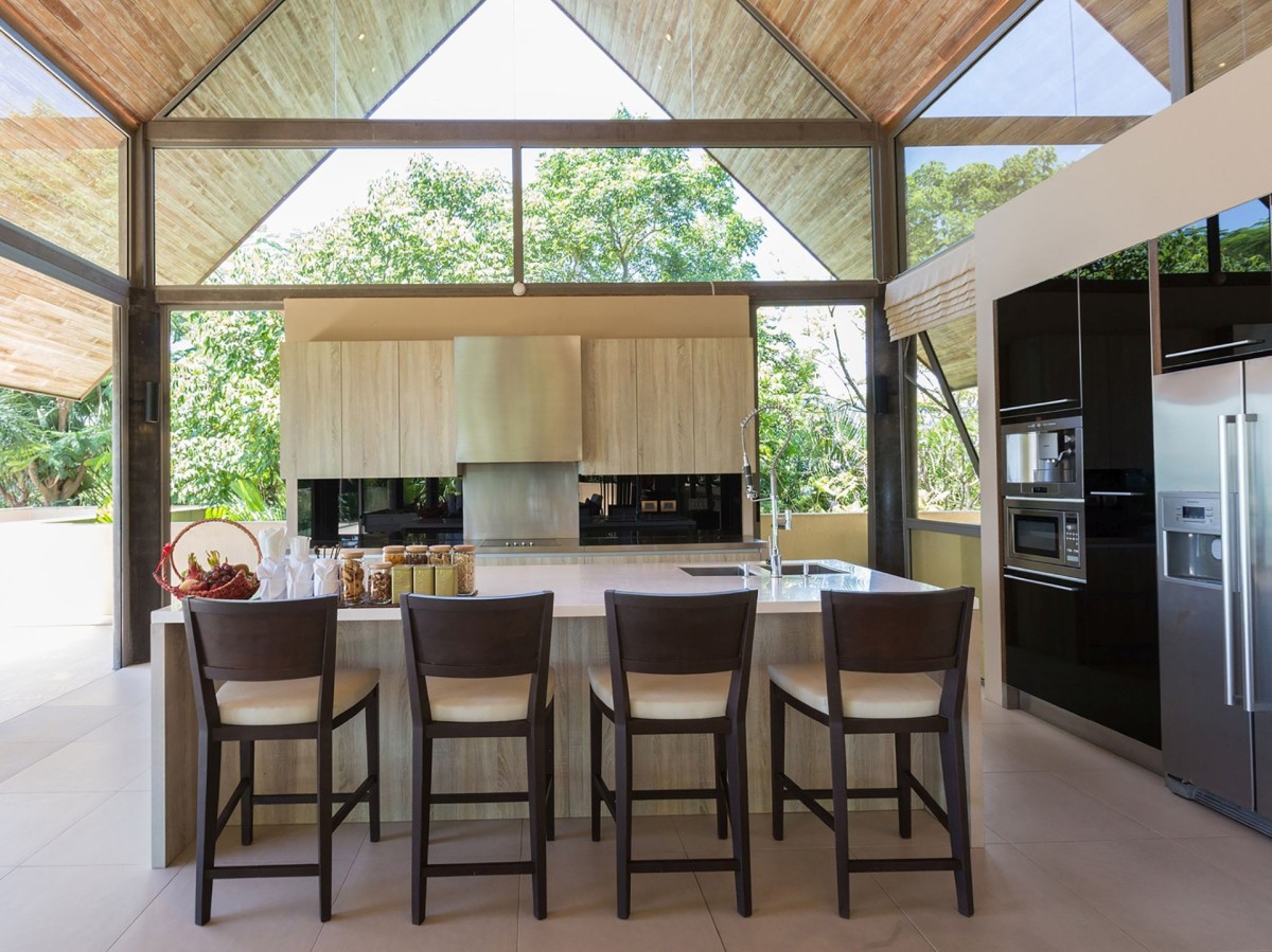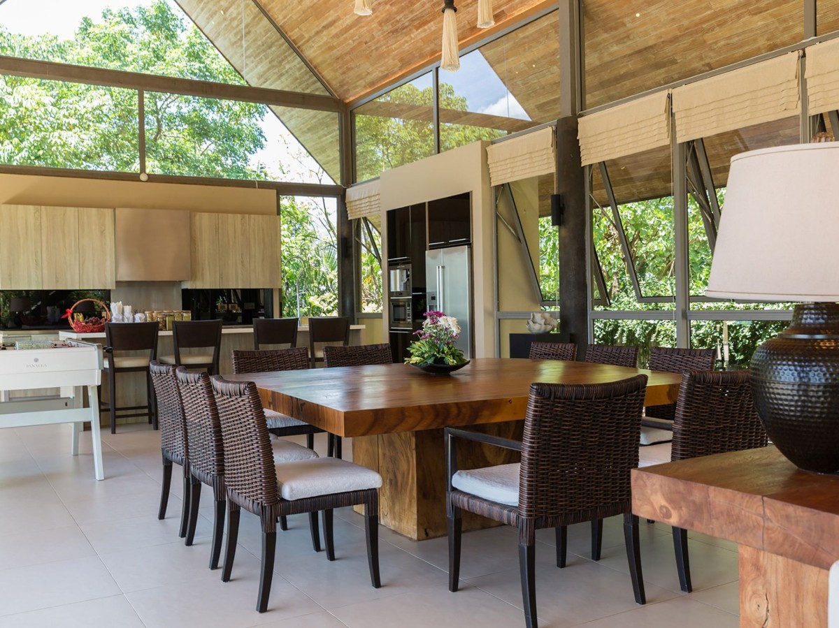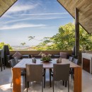 Step outside onto the full-length covered balcony, bordered by a glass balustrade and overlooking the tropical garden and the impressive 20-metre infinity pool. All-weather armchairs invite guests to unwind, take in the views, or enjoy a sunset cocktail in perfect comfort.