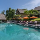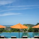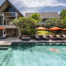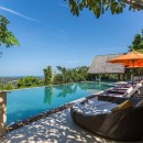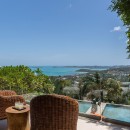 Descending the exterior stairs from either side of the balcony leads to the villa’s lower level, where three of the five king-sized bedrooms are located. These beautifully appointed rooms each offer spectacular views across the garden and pool, with ensuite bathrooms featuring contemporary rain showers. A covered walkway connects these rooms and leads to a manicured lawn that flows down to the wide pool terrace.