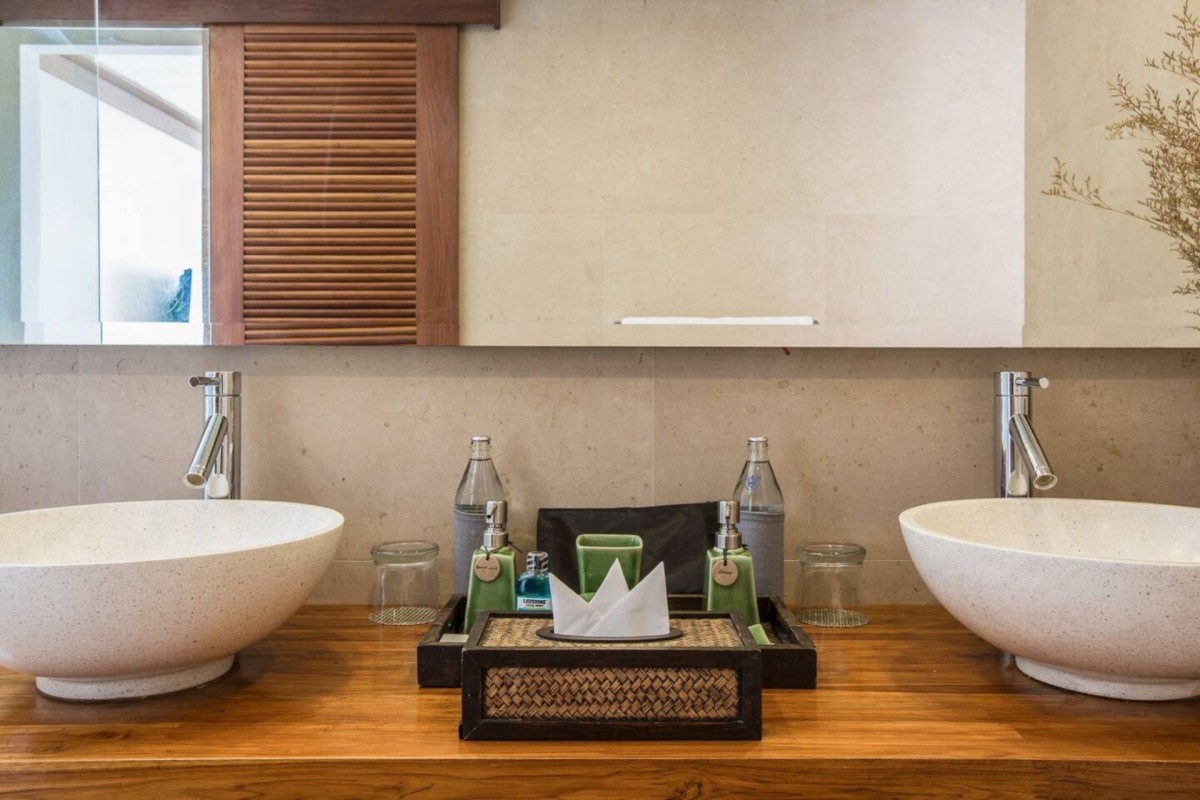 Inside the master suites, you'll find spacious dressing areas and luxurious ensuite bathrooms fitted with twin vanities, rain showers, and deep terrazzo bathtubs positioned by large windows offering serene views of the pool and ocean. Thoughtfully designed interiors, premium furnishings, and stylish accents elevate the bedrooms beyond simple sleeping quarters into personal sanctuaries.