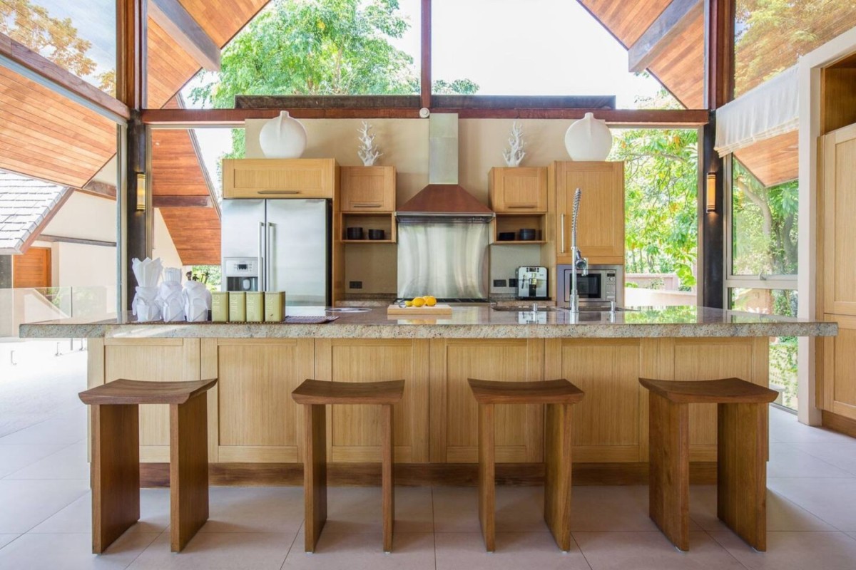 At one end of the pavilion, a stylish tropical lounge area is adorned with Thai artefacts, ambient table lamps, and plush rattan sofas and armchairs arranged around a Smart TV mounted on a wooden console. A square dining table that seats ten sits adjacent to the gourmet kitchen, which boasts premium branded appliances, honey-toned wooden cabinetry, sleek chrome fittings, and marble countertops. A central island with high stools invites casual breakfasts, evening cocktails, and social gatherings, complemented by a built-in wine cooler for all-day refreshments.