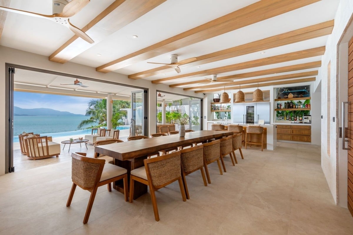 Outdoors, a large terrace overlooks Plai Laem Bay, Big Buddha, and Bangrak Bay, with shaded seating, alfresco dining, a Weber BBQ, and a 14-meter saltwater infinity pool with a shallow children’s area. Below, a grassy lawn leads to the sea, where kayaks are available to explore nearby Koh Som island.