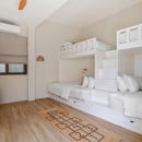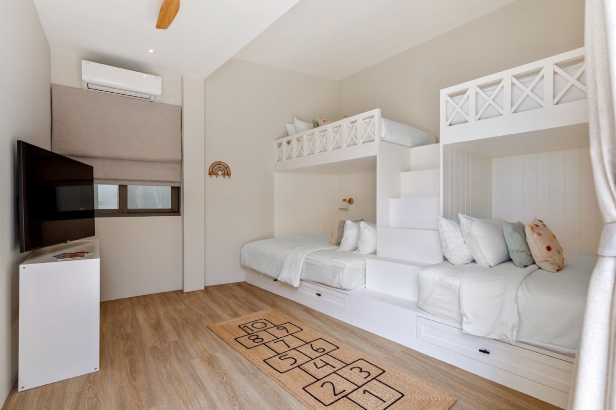 Bedroom 6: Kid's bedroom with two bunk beds (single over queen bed), WiFi, A/C, ceiling fan, TV, connected with bedroom 5, shared bathroom with shower, vanity, and WC. 4 kids maximum