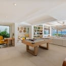 The main living level is open-plan and ideal for gathering, featuring a fully equipped modern kitchen, indoor dining for 12, a spacious lounge with an 85-inch TV, a pool table, a home office, and Wi-Fi throughout. A private air-conditioned gym completes the indoor facilities.