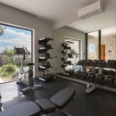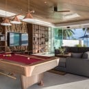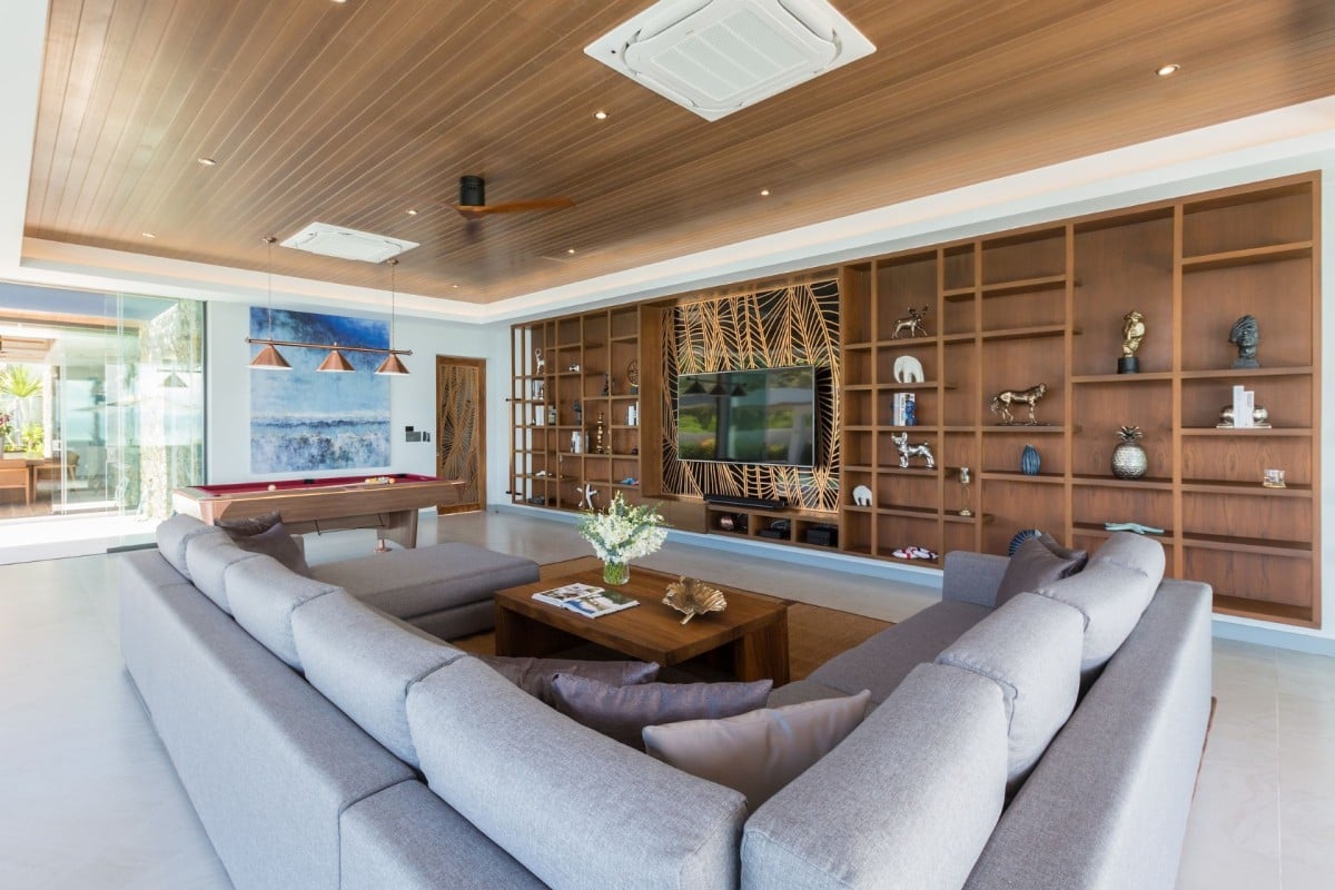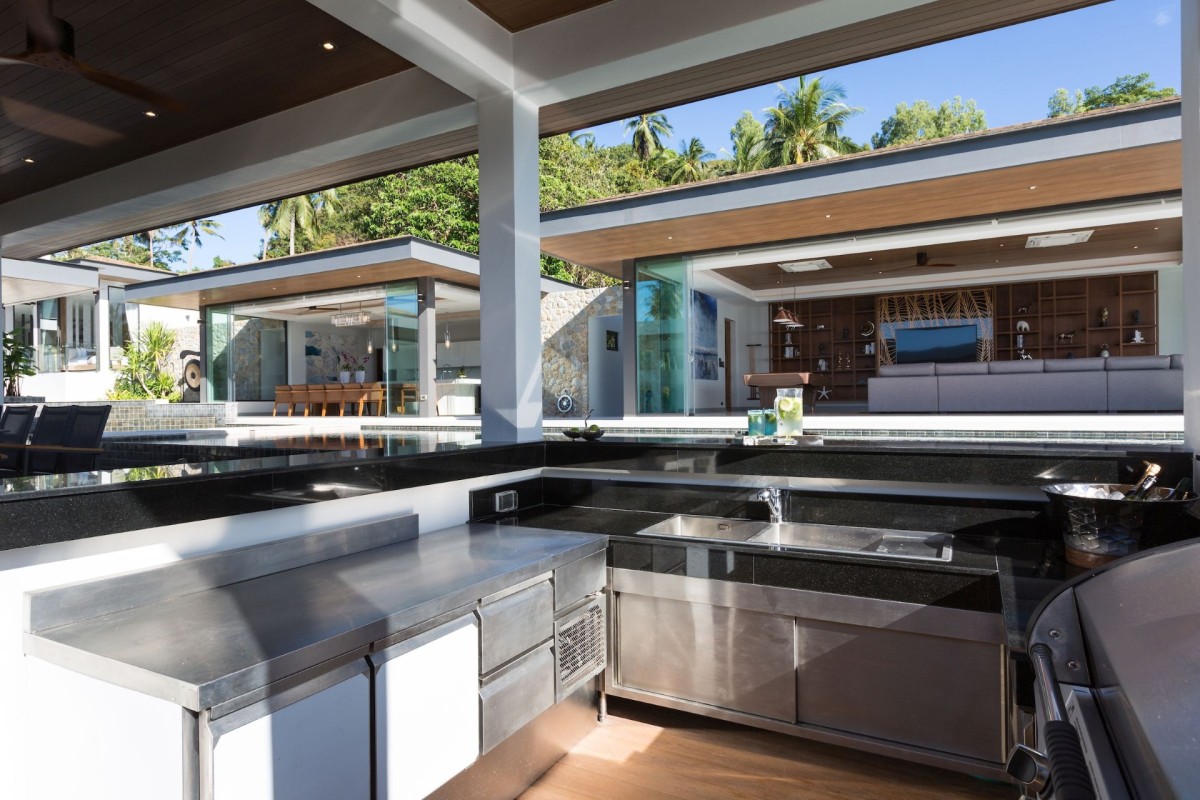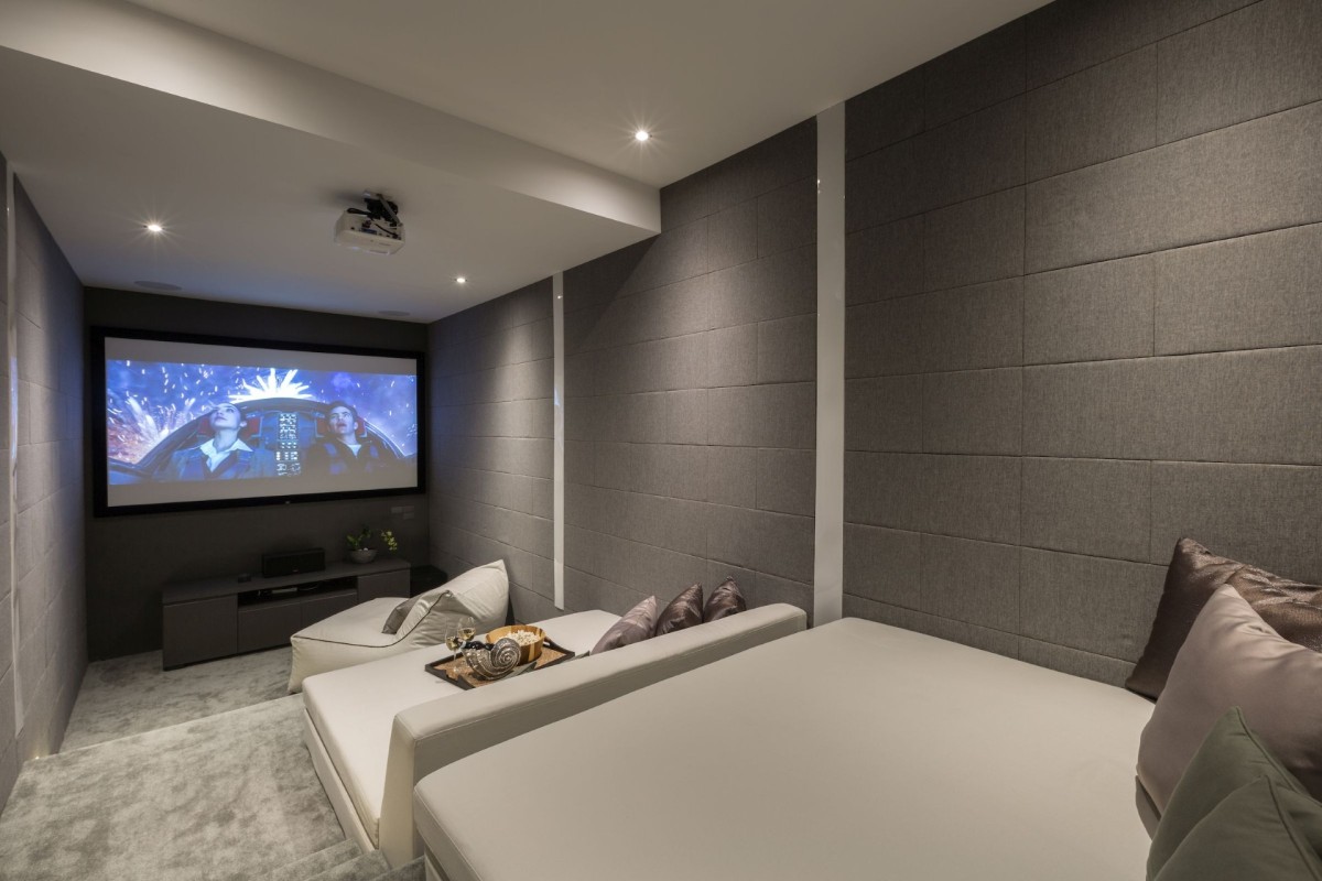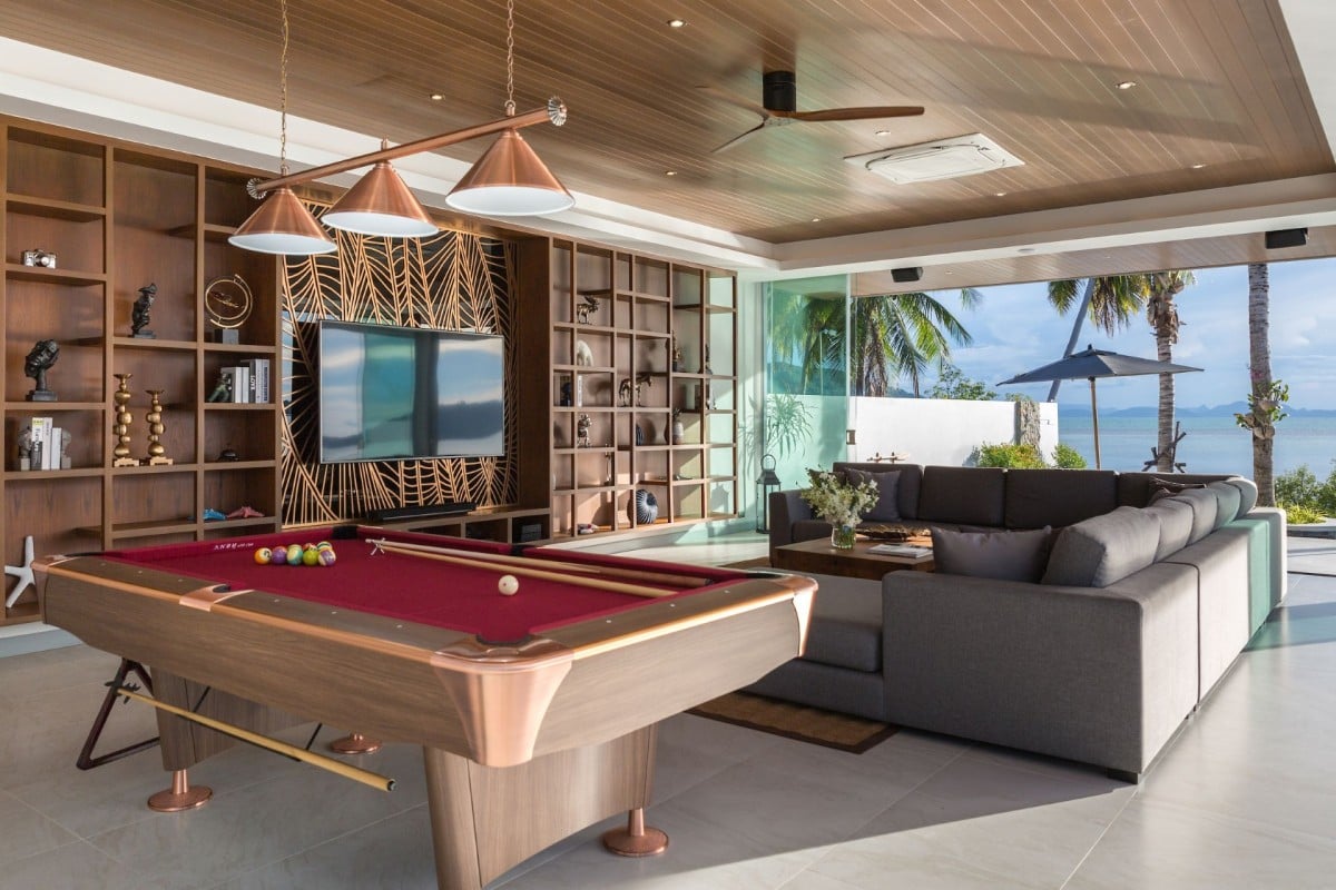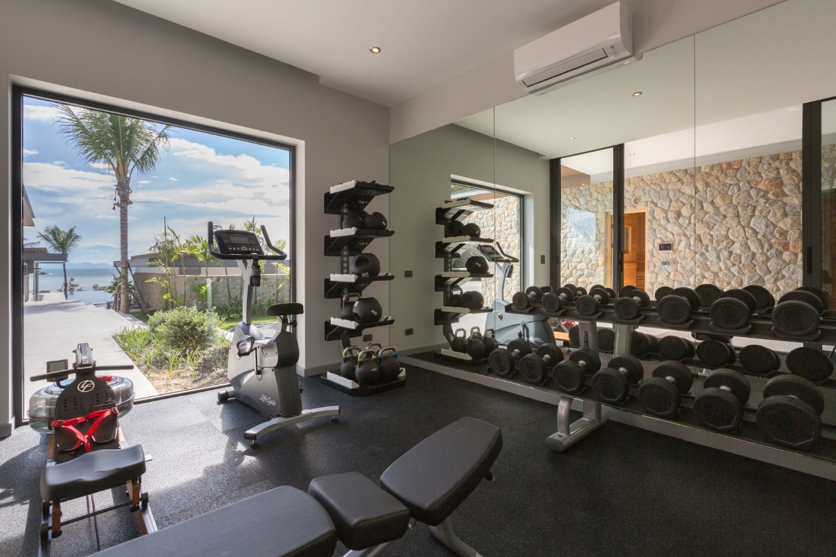 Amenities include a gym, sauna, massage sala, private cinema, kids’ play area with trampoline, and expansive indoor and outdoor living spaces. The social heart of the villa is the stunning pool deck, featuring a 21-meter lap pool, a kids’ pool, a swim-up bar, a BBQ, shaded dining areas, and multiple lounging zones, all leading directly to 25 meters of beachfront.