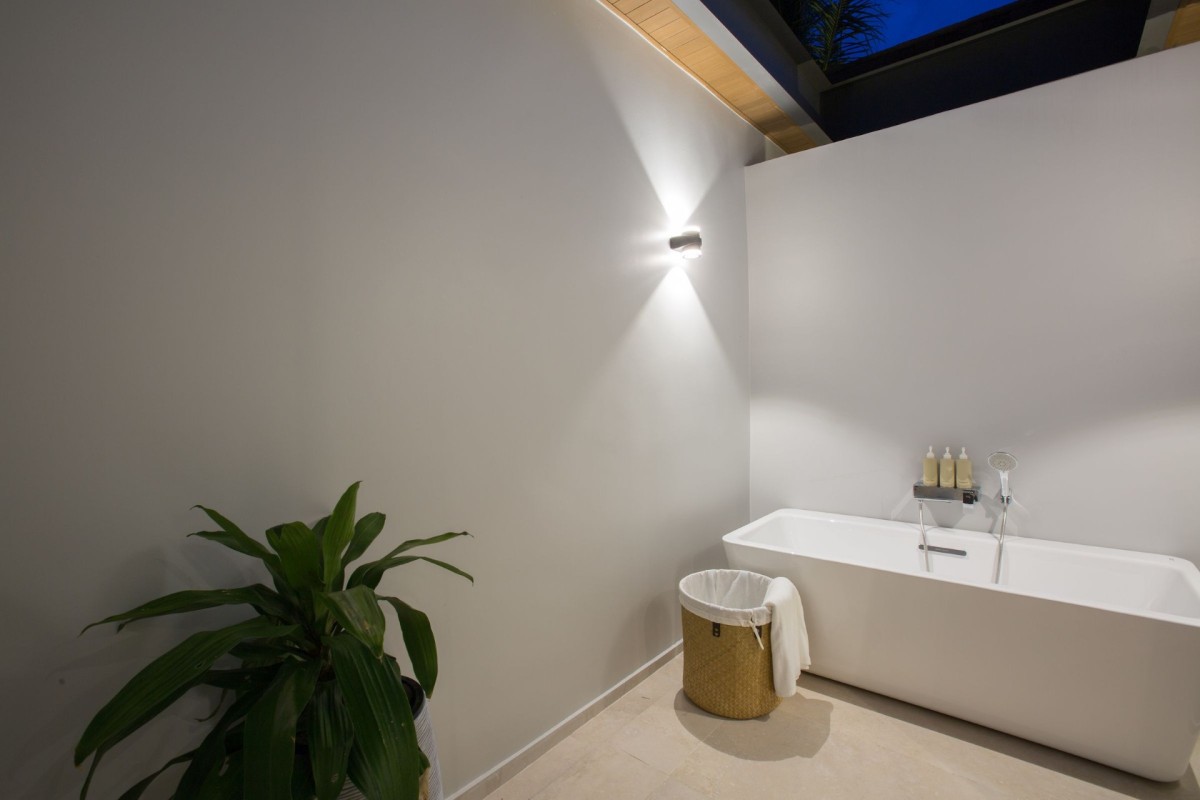 Bedroom 1: Master bedroom with a king-size bed, WiFi, A/C, safe, ocean view, en-suite bathroom with shower, outdoor bathtub, double vanity, and WC. 2 guests maximum