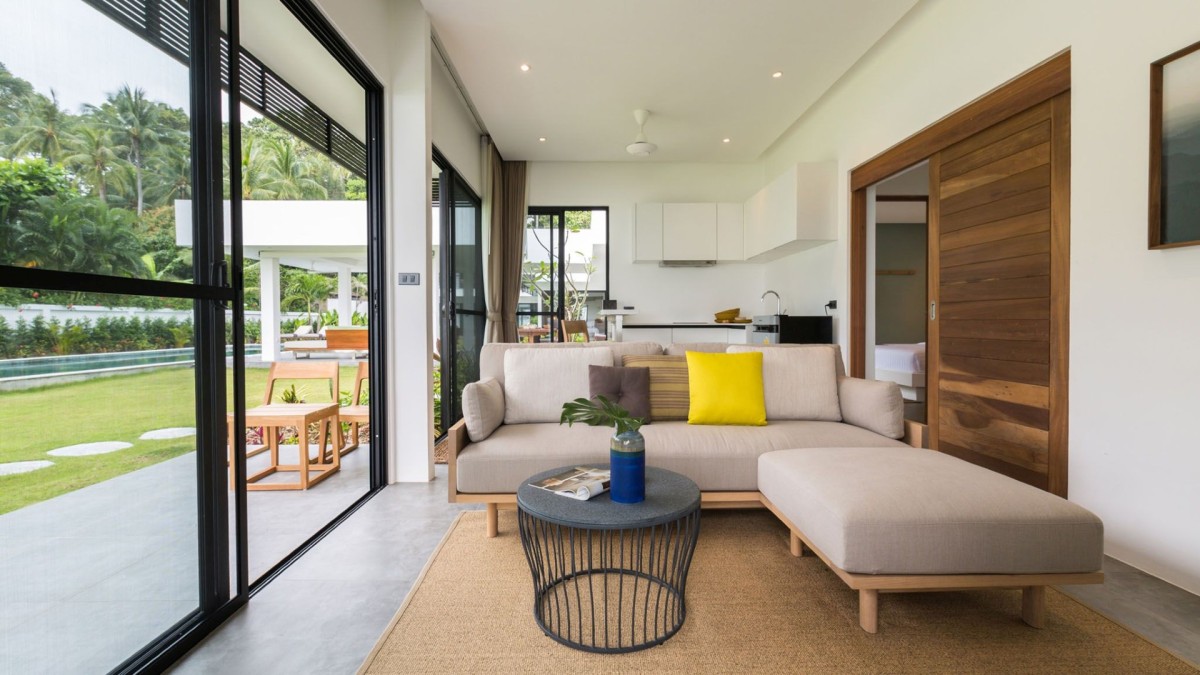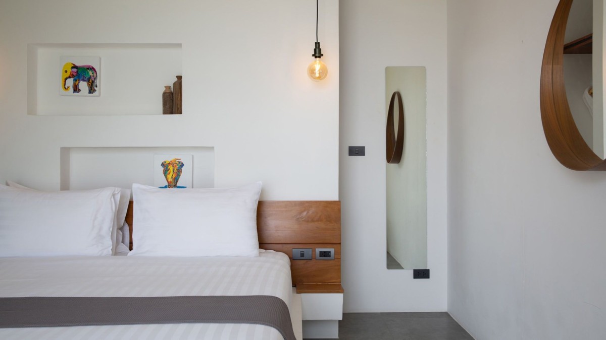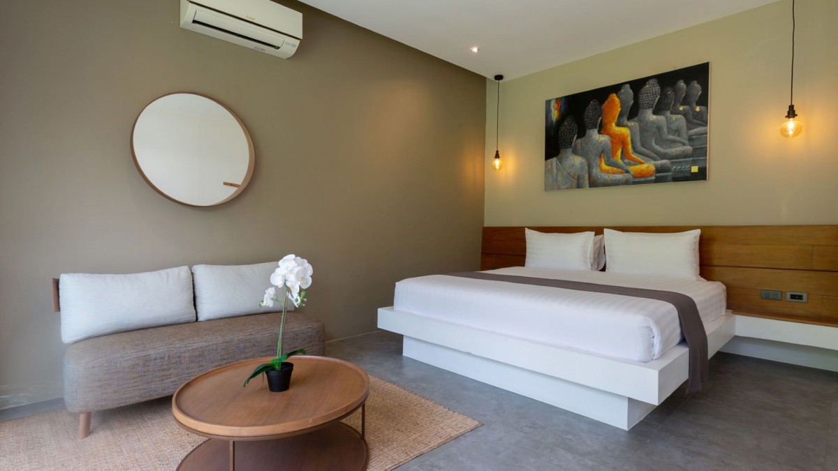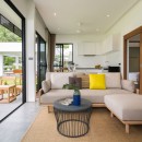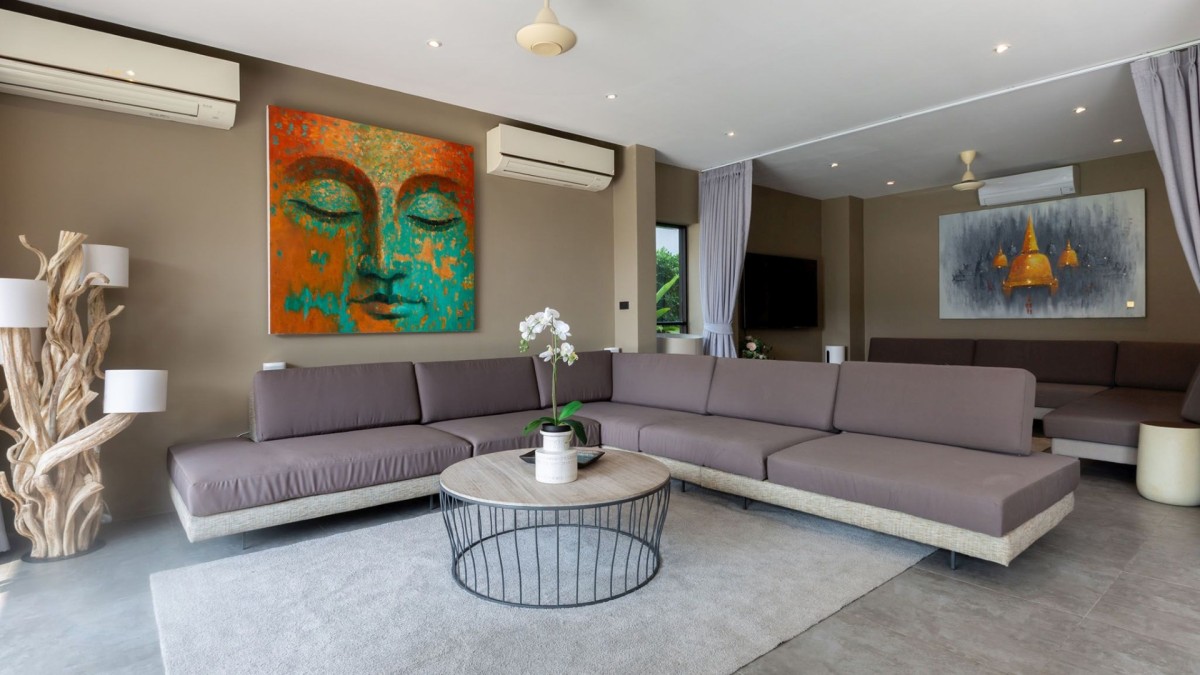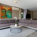 Designed with a sophisticated coastal aesthetic, Villa Thansamaay features cool grey ceramic floors, earthy woven rugs, and statement walls in soft olive and taupe. The interiors are completed with warm, textured furnishings, while the bathrooms offer elegant stone vanities and walk-in rain showers. Asian-inspired artwork and handcrafted artefacts throughout the villa provide vibrant accents and a distinct sense of place.