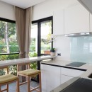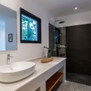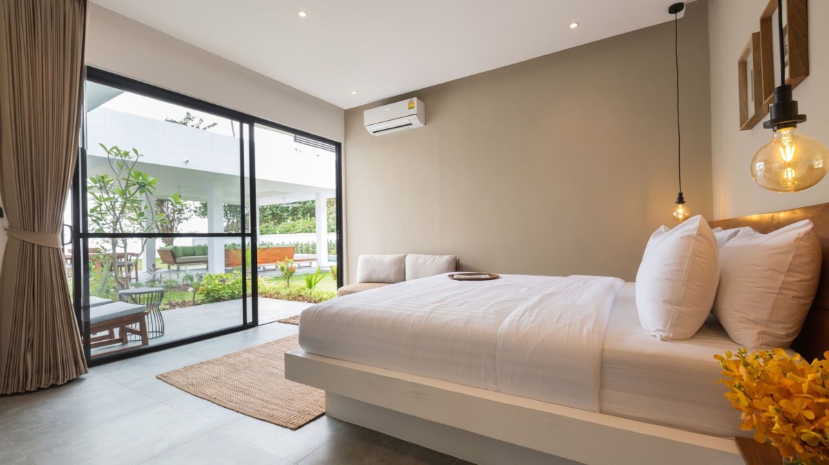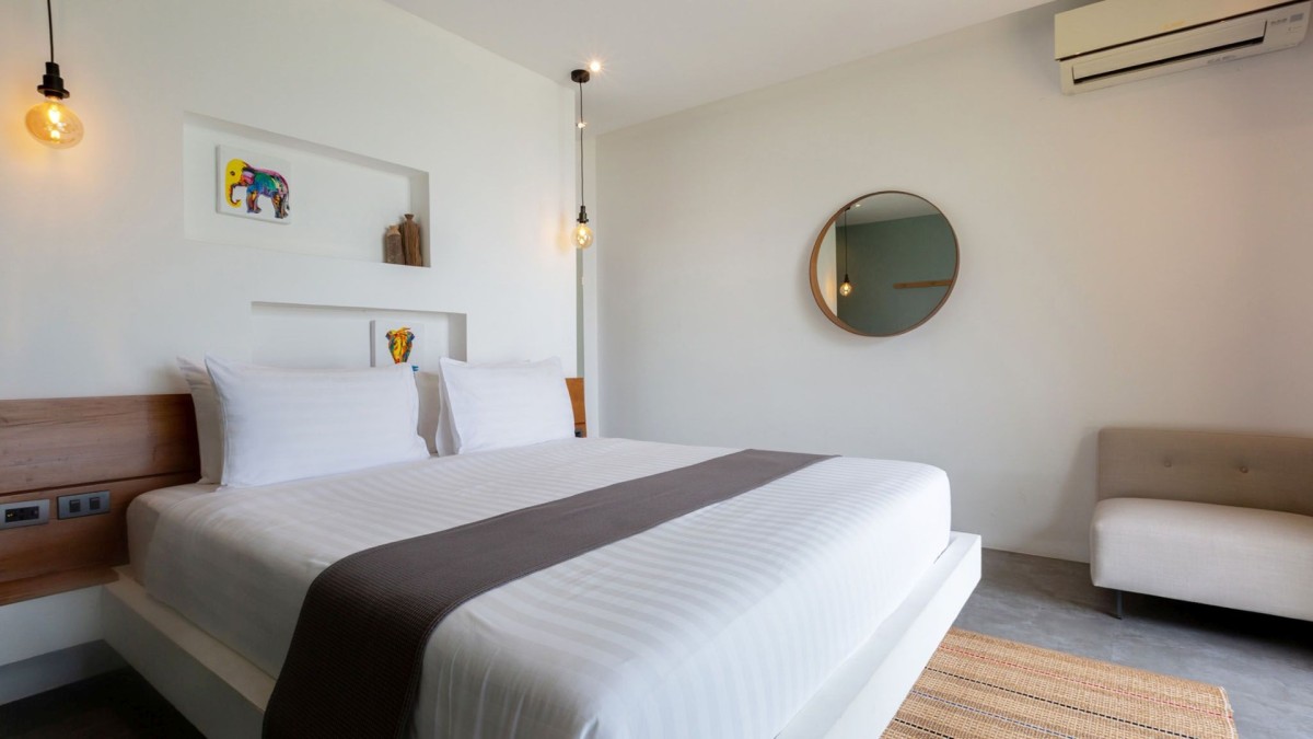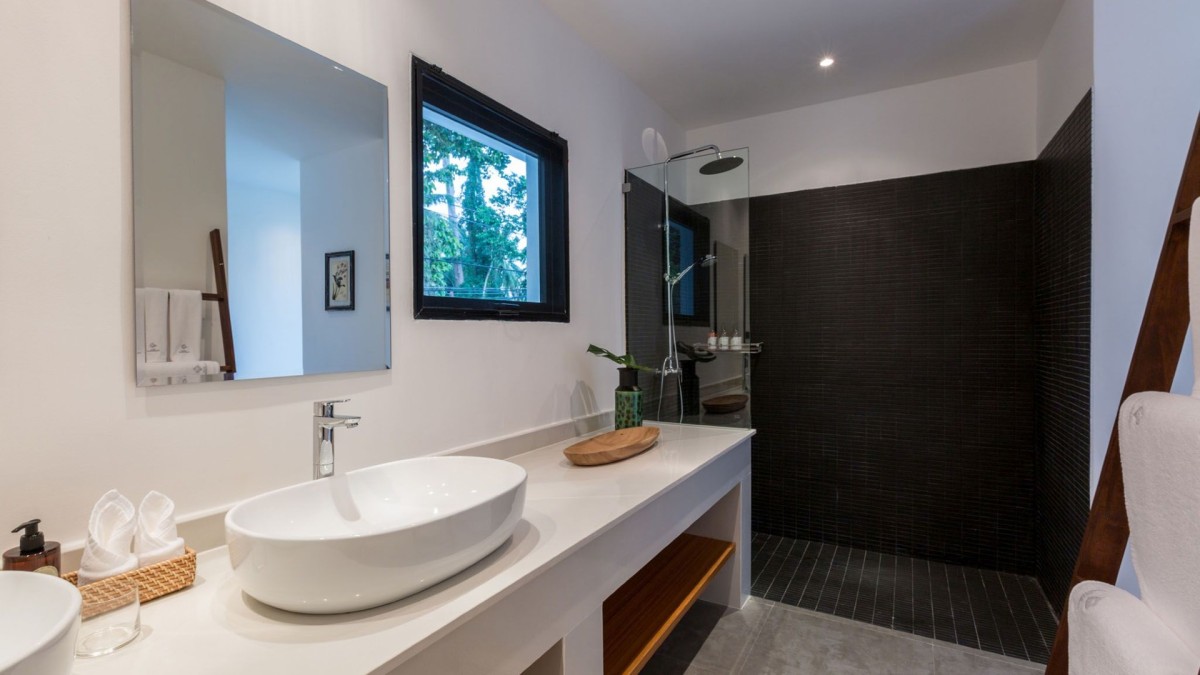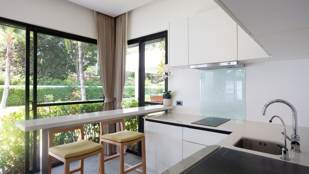 Designed with a sophisticated coastal aesthetic, Villa Thansamaay features cool grey ceramic floors, earthy woven rugs, and statement walls in soft olive and taupe. The interiors are completed with warm, textured furnishings, while the bathrooms offer elegant stone vanities and walk-in rain showers. Asian-inspired artwork and handcrafted artefacts throughout the villa provide vibrant accents and a distinct sense of place.